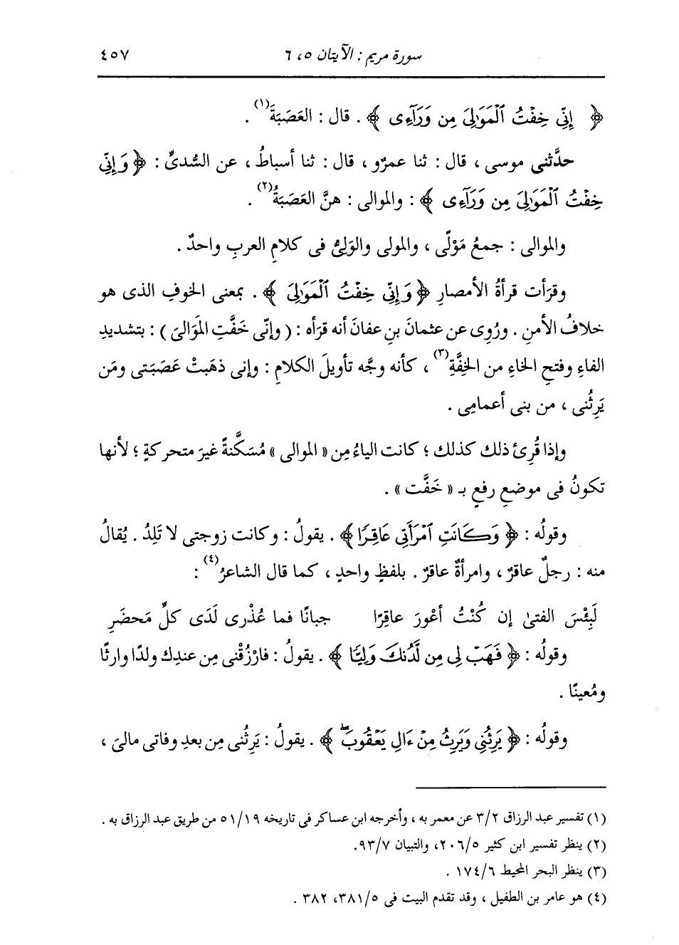 حَدَّثَنِي مُوسَى، قَالَ: ثنا عَمْرٌو، قَالَ: ثنا أَسْبَاطٌ، عَنِ السُّدِّيِّ، {§وَإِنِّي خِفْتُ الْمَوَالِيَ مِنْ وَرَائِي} [مريم: 5] وَالْمَوَالِي: هُنَّ الْعَصَبَةُ وَالْمَوَالِي: جَمْعُ مَوْلًى، وَالْمَوْلَى وَالْوَلِيُّ فِي كَلَامِ الْعَرَبِ وَاحِدٌ. وَقَرَأَتْ قُرَّاءُ الْأَمْصَارِ: {وَإِنِّي خِفْتُ الْمَوَالِيَ} [مريم: 5] بِمَعْنَى: الْخَوْفِ الَّذِي هُوَ خَوْفُ الْأَمْنِ. وَرُوِي عَنْ عُثْمَانَ بْنِ عَفَّانَ أَنَّهُ قَرَأَهُ: «وَإِنِّي خَفَّتِ الْمَوَالِي» بِتَشْدِيدِ الْفَاءِ وَفَتْحِ الْخَاءِ مِنَ الْخِفَّةِ، كَأَنَّهُ وَجْهُ تَأْوِيلِ الْكَلَامِ: وَإِنِّي ذَهَبَتْ عَصَبَتِي وَمَنْ يَرِثُنِي مِنْ بَنِي أَعْمَامِي. وَإِذَا قُرِئَ ذَلِكَ كَذَلِكَ كَانَتِ الْيَاءُ مِنَ الْمَوَالِي مُسَكَّنَةً غَيْرَ مُتَحَرِّكَةٍ، لِأَنَّهَا تَكُونُ فِي مَوْضِعِ رَفْعٍ بِخَفَّتْ