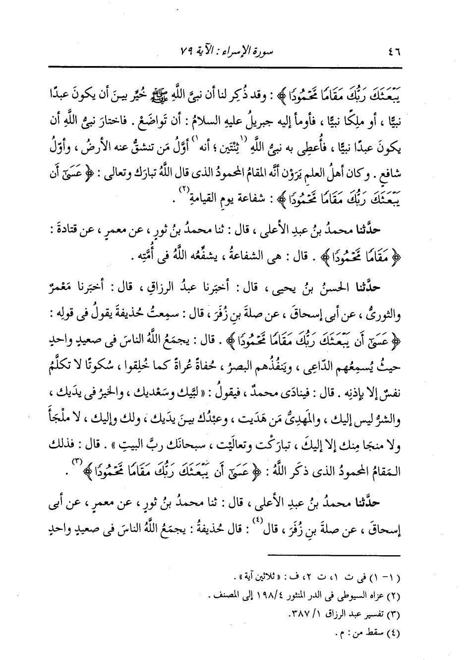 حَدَّثَنَا الْحَسَنُ بْنُ يَحْيَى، قَالَ: أَخْبَرَنَا عَبْدُ الرَّزَّاقِ، قَالَ: أَخْبَرَنَا مَعْمَرٌ وَالثَّوْرِيُّ، عَنْ أَبِي إِسْحَاقَ، عَنْ صِلَةَ بْنِ زُفَرَ، قَالَ: سَمِعْتُ حُذَيْفَةَ يَقُولُ فِي قَوْلِهِ: {§عَسَى أَنْ يَبْعَثَكَ رَبُّكَ مَقَامًا مَحْمُودًا} [الإسراء: 79] قَالَ: يَجْمَعُ اللَّهُ النَّاسَ فِي صَعِيدٍ وَاحِدٍ حَيْثُ يُسْمِعُهُمُ الدَّاعِي، فَيُنْفُذِهُمُ الْبَصَرَ حُفَاةً عُرَاةً، كَمَا خُلِقُوا سُكُوتًا لَا تَكَلَّمُ نَفْسٌ إِلَّا بِإِذْنِهِ، قَالَ: فَيُنَادَى مُحَمَّدٌ، فَيَقُولُ: لَبَّيْكَ وَسَعْدَيْكَ، وَالْخَيْرُ فِي يَدَيْكَ، وَالشَّرُّ لَيْسَ إِلَيْكَ، وَالْمَهْدِيُّ مَنْ هَدَيْتَ، وَعَبْدُكَ بَيْنَ يَدَيْكَ، وَلَكَ وَإِلَيْكَ، لَا مَلْجَأَ وَلَا مَنْجَى مِنْكَ إِلَّا إِلَيْكَ، تَبَارَكْتَ وَتَعَالَيْتَ، سُبْحَانَكَ رَبَّ الْبَيْتِ، قَالَ: فَذَلِكَ الْمَقَامُ الْمَحْمُودُ الَّذِي ذَكَرَ اللَّهُ {عَسَى أَنْ يَبْعَثَكَ رَبُّكَ مَقَامًا مَحْمُودًا} [الإسراء: 79]