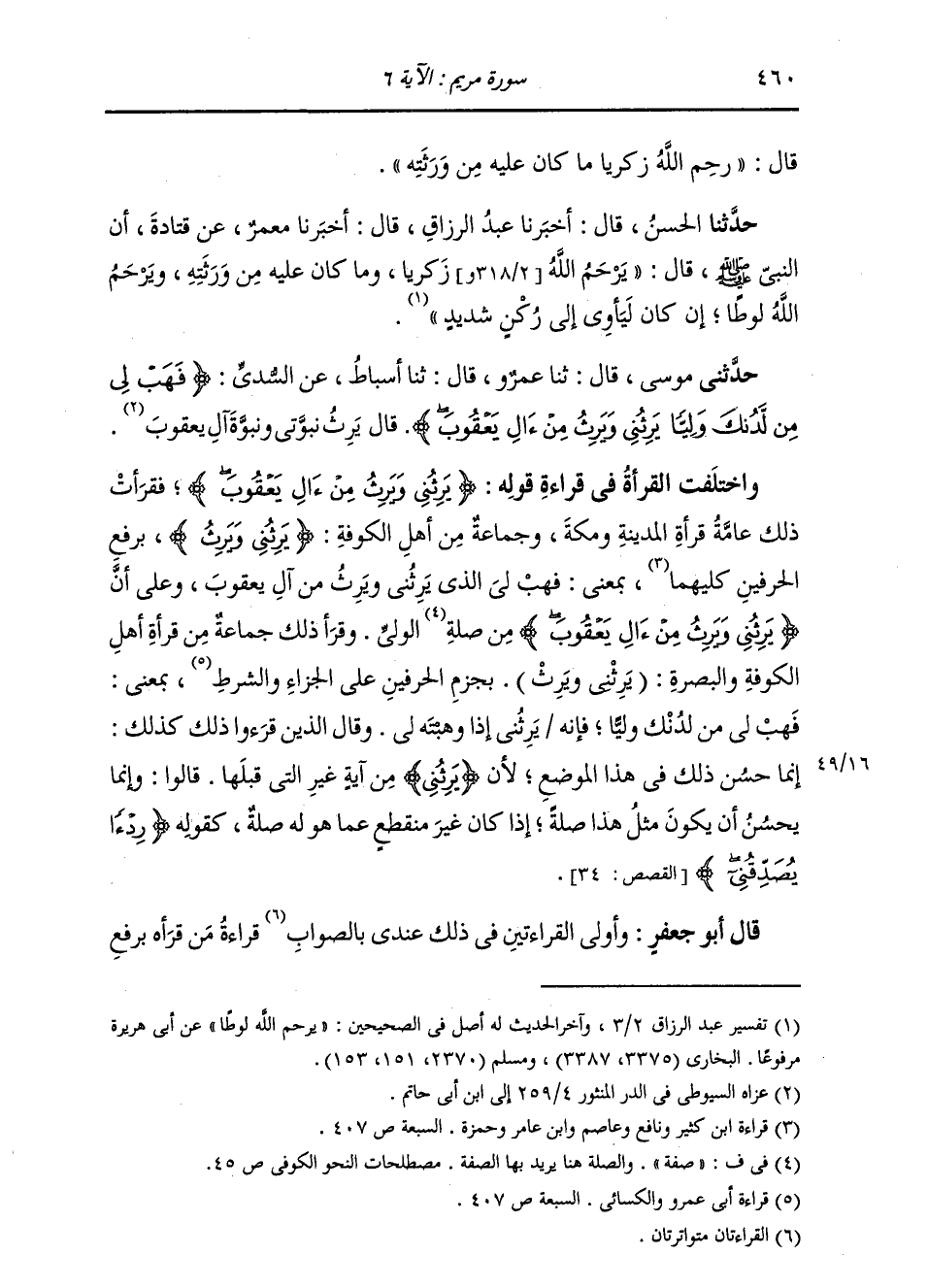 حَدَّثَنِي مُوسَى، قَالَ: ثنا عَمْرٌو، قَالَ: ثنا أَسْبَاطٌ، عَنِ السُّدِّيِّ، {§فَهَبْ لِي مِنْ لَدُنْكَ وَلِيًّا يَرِثُنِي وَيَرِثُ مِنْ آلِ يَعْقُوبَ} [مريم: 6] قَالَ: يَرِثُ نُبُوَّتِي وَنُبُوَّةَ آلِ يَعْقُوبَ وَاخْتَلَفَتِ الْقُرَّاءُ فِي قِرَاءَةِ قَوْلِهِ: {يَرِثُنِي وَيَرِثُ مِنْ آلِ يَعْقُوبَ} [مريم: 6] فَقَرَأَتْ ذَلِكَ عَامَّةُ قُرَّاءِ الْمَدِينَةِ وَمَكَّةَ وَجَمَاعَةٌ مِنْ أَهْلِ الْكُوفَةِ: {يَرِثُنِي وَيَرِثُ} [مريم: 6] بِرَفْعِ الْحَرْفَيْنِ كِلَيْهِمَا، بِمَعْنَى فَهَبِ الَّذِي يَرِثُنِي وَيَرِثُ مِنْ آلِ يَعْقُوبَ، عَلَى أَنْ يَرِثَنِي وَيَرِثَ مِنْ آلِ يَعْقُوبَ، مِنْ صِلَةِ الْوَلِيِّ. وَقَرَأَ ذَلِكَ جَمَاعَةٌ مِنْ قُرَّاءِ أَهْلِ الْكُوفَةِ وَالْبَصْرَةِ: (يَرِثْنِي وَيَرِثْ) بِجَزْمِ الْحَرْفَيْنِ عَلَى الْجَزَاءِ وَالشَّرْطِ، بِمَعْنَى: فَهَبْ لِي مِنْ لَدُنْكَ وَلِيًّا فَإِنَّهُ يَرِثُنِي إِذَا وَهَبْتَهُ لِي. وَقَالَ الَّذِينَ قَرَءُوا ذَلِكَ كَذَلِكَ: إِنَّمَا حَسُنَ ذَلِكَ فِي هَذَا الْمَوْضِعِ، لِأَنَّ يَرِثُنِي مِنْ آيَةٍ غَيْرِ الَّتِي قَبْلَهَا. قَالُوا وَإِنَّمَا يَحْسُنُ أَنْ يَكُونَ مِثْلُ هَذَا صِلَةً، إِذَا كَانَ غَيْرَ مُنْقَطِعٍ عَمَّا هُوَ لَهُ صِلَةٌ، كَقَوْلِهِ: {رِدْءًا يُصَدِّقُنِي} [القصص: 34] . قَالَ أَبُو جَعْفَرٍ: وَأَوْلَى الْقِرَاءَتَيْنِ عِنْدِي فِي ذَلِكَ بِالصَّوَابِ قِرَاءَةُ مَنْ قَرَأَهُ بِرَفْعِ