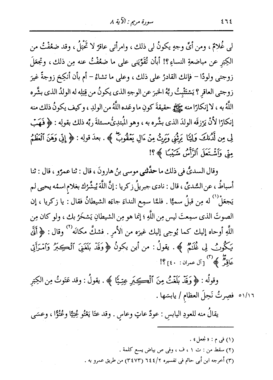 حَدَّثَنِي مُوسَى بْنُ هَارُونَ، قَالَ: ثنا عَمْرٌو، قَالَ: ثنا أَسْبَاطٌ، عَنِ السُّدِّيِّ، قَالَ: §نَادَى جَبْرَائِيلُ زَكَرِيَّا: إِنَّ اللَّهَ يُبَشِّرُكُ بِغُلَامٍ اسْمُهُ يَحْيَى لَمْ نَجْعَلْ لَهُ مِنْ قَبْلُ سَمِيًّا، فَلَمَّا سَمِعَ النِّدَاءَ، جَاءَهُ الشَّيْطَانُ فَقَالَ: يَا زَكَرِيَّا إِنَّ الصَّوْتَ الَّذِي سَمِعْتَ لَيْسَ مِنَ اللَّهِ، إِنَّمَا هُوَ مِنَ الشَّيْطَانِ يَسْخَرُ بِكَ، وَلَوْ كَانَ مِنَ اللَّهِ أَوْحَاهُ إِلَيْكَ كَمَا يُوحِي إِلَيْكَ غَيْرَهُ مِنَ الْأَمْرِ، فَشَكَّ وَقَالَ: {أَنَّى يَكُونُ لِي غُلَامٌ} [مريم: 8] يَقُولُ: مِنْ أَيْنَ يَكُونُ {وَقَدْ بَلَغَنِي الْكِبَرُ وَامْرَأَتِي عَاقِرٌ} [آل عمران: 40]