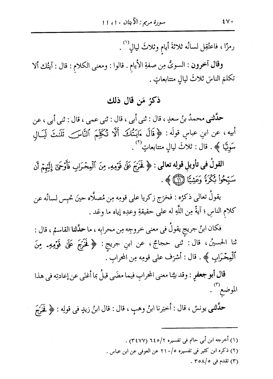 حَدَّثَنَا الْقَاسِمُ، قَالَ: ثنا الْحُسَيْنُ، قَالَ: ثني حَجَّاجٌ، عَنِ ابْنِ جُرَيْجٍ، {§فَخَرَجَ عَلَى قَوْمِهِ مِنَ الْمِحْرَابِ} [مريم: 11] قَالَ: أَشْرَفَ عَلَى قَوْمِهِ مِنَ الْمِحْرَابِ قَالَ أَبُو جَعْفَرٍ: وَقَدْ بَيَّنَّا مَعْنَى الْمِحْرَابِ فِيمَا مَضَى قَبْلُ، بِمَا أَغْنَى عَنْ إِعَادَتِهِ فِي هَذَا الْمَوْضِعِ