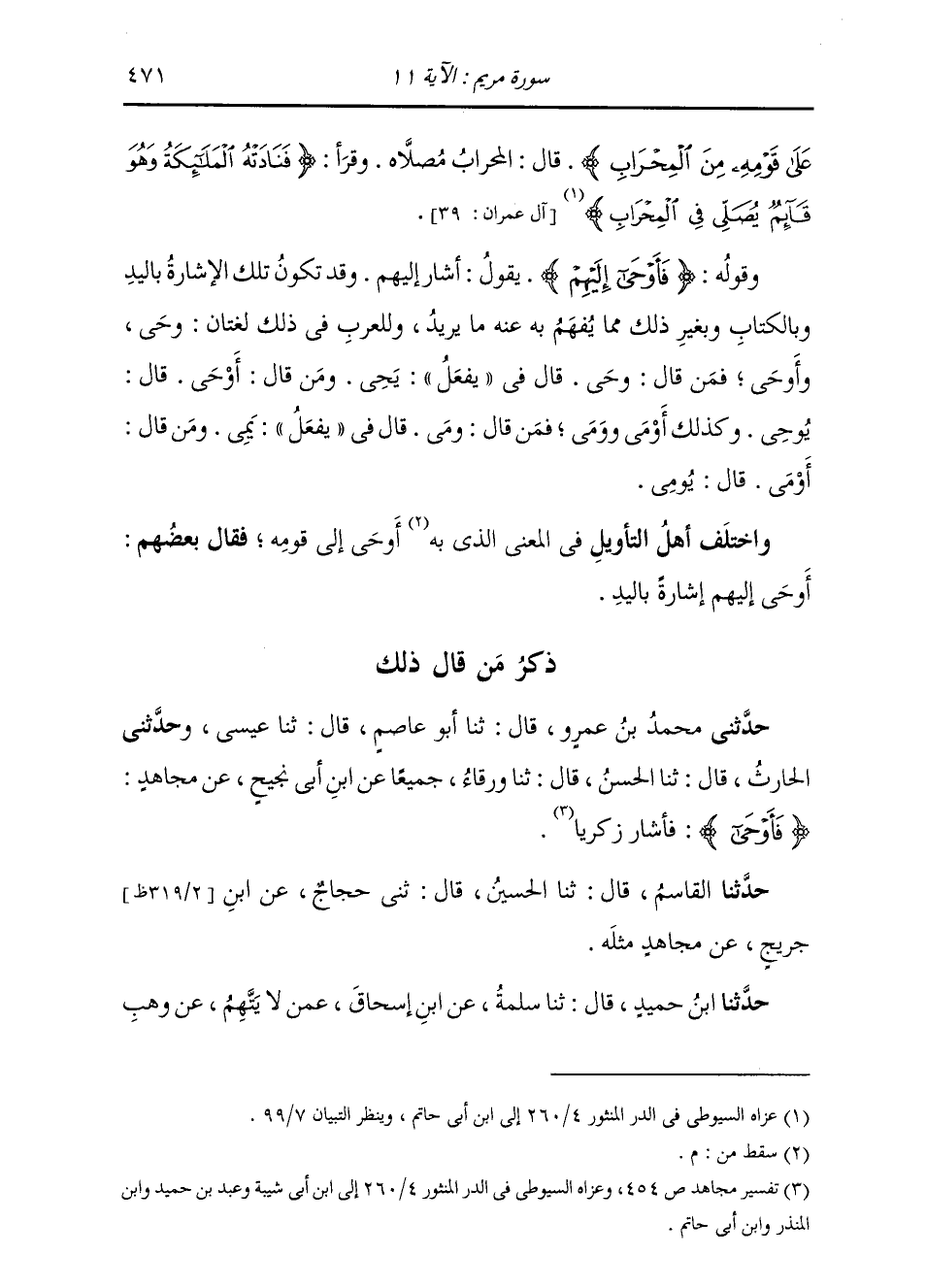 ذِكْرُ مَنْ قَالَ ذَلِكَ: حَدَّثَنِي مُحَمَّدُ بْنُ عَمْرٍو، قَالَ: ثنا أَبُو عَاصِمٍ، قَالَ: ثنا عِيسَى، وَحَدَّثَنِي الْحَارِثُ، قَالَ: ثنا الْحَسَنُ، قَالَ: ثنا وَرْقَاءُ، جَمِيعًا عَنِ ابْنِ أَبِي نَجِيحٍ، عَنْ مُجَاهِدٍ، {§فَأَوْحَى} [مريم: 11] فَأَشَارَ زَكَرِيَّا حَدَّثَنَا الْقَاسِمُ، قَالَ: ثنا الْحُسَيْنُ، قَالَ: ثني حَجَّاجٌ، عَنِ ابْنِ جُرَيْجٍ، عَنْ مُجَاهِدٍ، مِثْلَهُ