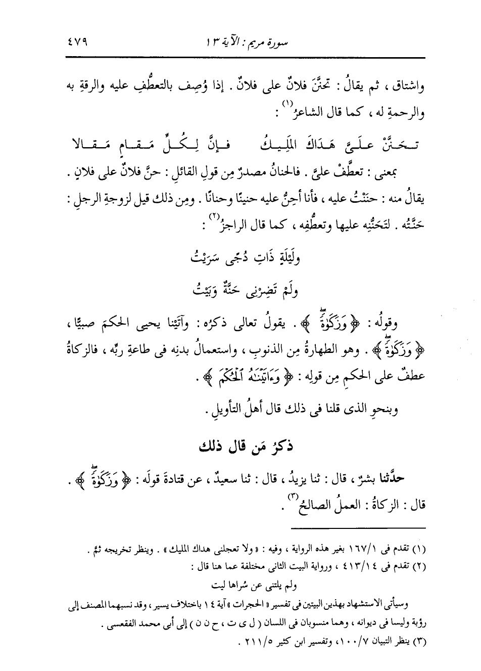 ذِكْرُ مَنْ قَالَ ذَلِكَ: حَدَّثَنَا بِشْرٌ، قَالَ: ثنا يَزِيدُ، قَالَ: ثنا سَعِيدٌ، عَنْ قَتَادَةَ، قَوْلُهُ: {§وَزَكَاةً} [مريم: 13] قَالَ: الزَّكَاةُ: الْعَمَلُ الصَّالِحُ