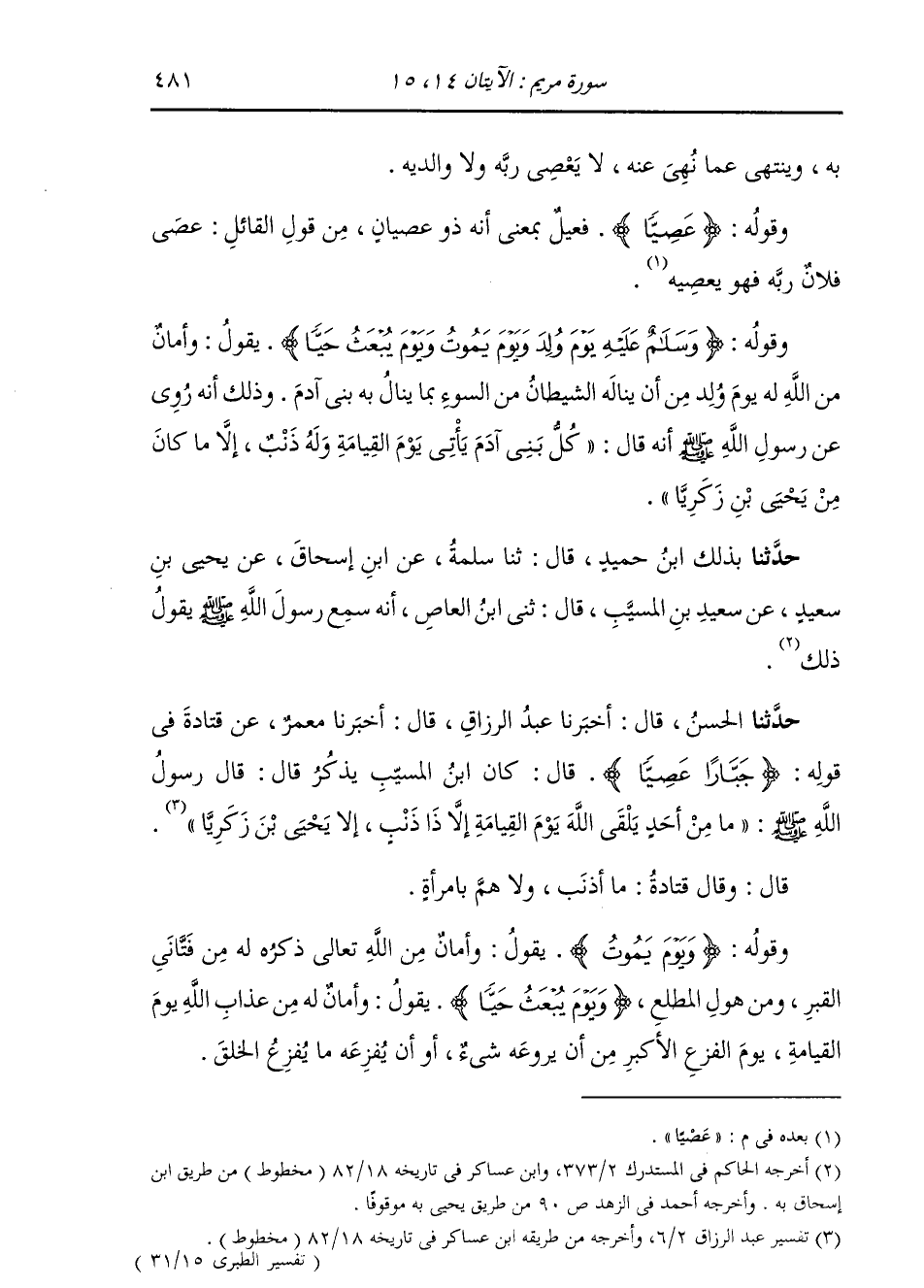 §وَقَوْلُهُ: {وَسَلَامٌ عَلَيْهِ يَوْمَ وُلِدَ وَيَوْمَ يَمُوتُ وَيَوْمَ يُبْعَثُ حَيًّا} [مريم: 15] يَقُولُ: وَأَمَانٌ مِنَ اللَّهِ يَوْمَ وُلِدَ مِنْ أَنْ يَنَالَهُ الشَّيْطَانُ مِنَ السُّوءِ، بِمَا يَنَالُ بِهِ بَنِي آدَمَ، وَذَلِكَ أَنَّهُ