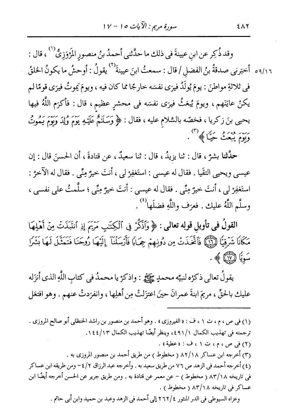 §الْقَوْلُ فِي تَأْوِيلِ قَوْلِهِ تَعَالَى: {وَاذْكُرْ فِي الْكِتَابِ مَرْيَمَ إِذِ انْتَبَذَتْ مِنْ أَهْلِهَا مَكَانًا شَرْقِيًّا فَاتَّخَذَتْ مِنْ دُونِهِمْ حِجَابًا فَأَرْسَلْنَا إِلَيْهَا رُوحَنَا فَتَمَثَّلَ لَهَا بَشَرًا سَوِيًّا} [مريم: 17] يَقُولُ تَعَالَى ذِكْرُهُ لِنَبِيِّهِ مُحَمَّدٍ صَلَّى اللهُ عَلَيْهِ وَسَلَّمَ: وَاذْكُرْ يَا مُحَمَّدُ فِي كِتَابِ اللَّهِ الَّذِي أَنْزَلَهُ عَلَيْكَ بِالْحَقِّ مَرْيَمَ ابْنَةَ عِمْرَانَ، حِينَ اعْتَزَلَتْ مِنْ أَهْلِهَا، وَانْفَرَدَتْ عَنْهُمْ، وَهُوَ افْتَعَلَ -[483]- مِنَ النَّبْذِ، وَالنَّبْذُ: الطَّرْحُ، وَقَدْ بَيَّنَّا ذَلِكَ بِشَوَاهِدِهِ فِيمَا مَضَى قَبْلُ. وَبِنَحْوِ الَّذِي قُلْنَا فِي ذَلِكَ قَالَ أَهْلُ التَّأْوِيلِ
