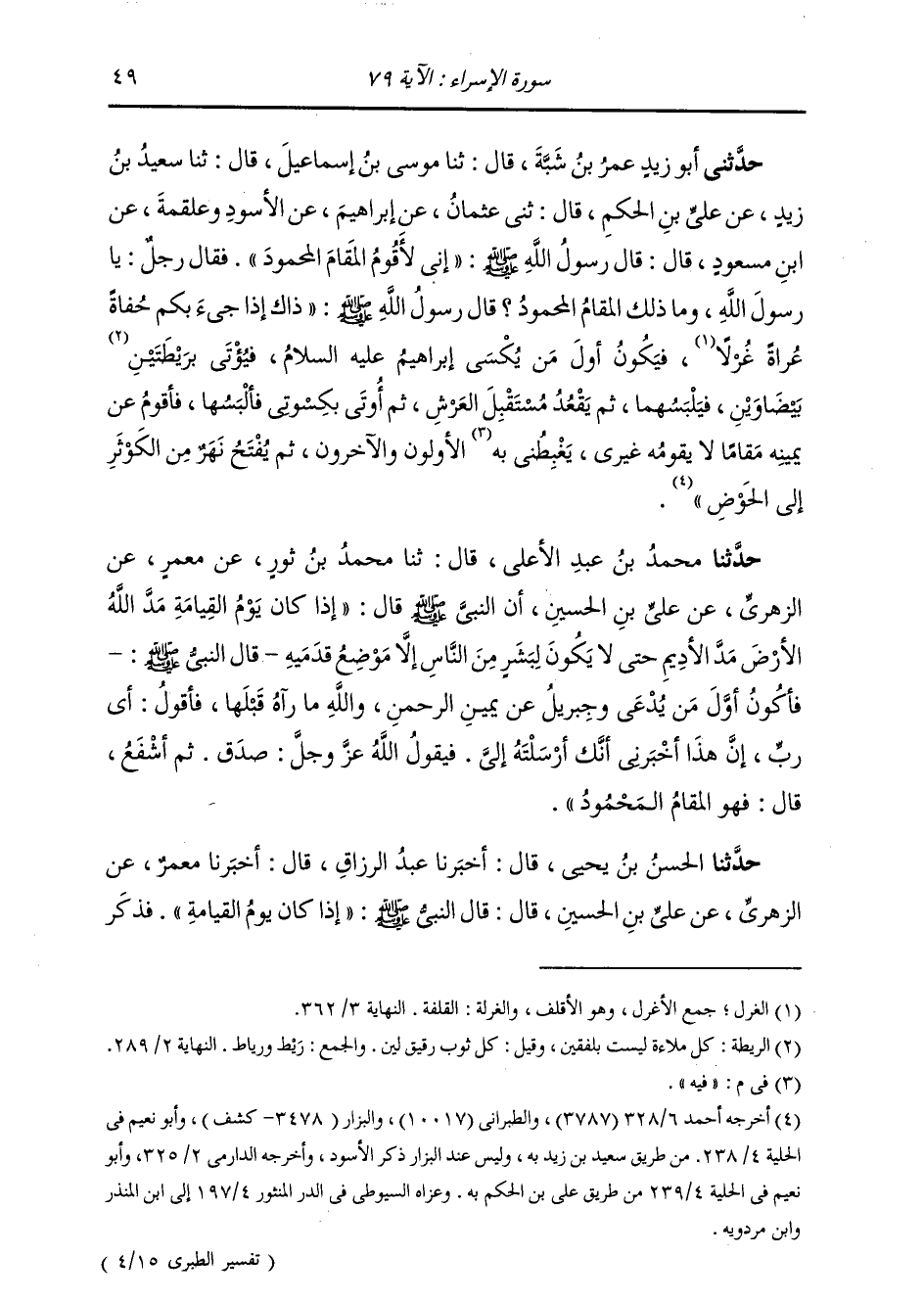 حَدَّثَنِي أَبُو زَيْدٍ عُمَرُ بْنُ شَبَّةَ، قَالَ: ثنا مُوسَى بْنُ إِسْمَاعِيلَ، قَالَ: ثنا سَعِيدُ بْنُ زَيْدٍ، عَنْ عَلِيِّ بْنِ الْحَكَمِ، قَالَ: ثني عُثْمَانُ، عَنْ إِبْرَاهِيمَ، عَنِ الْأَسْوَدِ، وَعَلْقَمَةَ، عَنِ ابْنِ مَسْعُودٍ، قَالَ: قَالَ رَسُولُ اللَّهِ صَلَّى اللهُ عَلَيْهِ وَسَلَّمَ: «§إِنِّي لَأَقُومُ الْمَقَامَ الْمَحْمُودَ» فَقَالَ رَجُلٌ: يَا رَسُولَ اللَّهِ، وَمَا ذَلِكَ الْمَقَامُ الْمَحْمُودُ؟ قَالَ رَسُولُ اللَّهِ صَلَّى اللهُ عَلَيْهِ وَسَلَّمَ: «ذَاكَ إِذَا جِيءَ بِكُمْ حُفَاةً عُرَاةً غُرْلًا فَيَكُونُ أَوَّلَ مَنْ يُكْسَى إِبْرَاهِيمُ عَلَيْهِ السَّلَامُ، فَيُؤْتَى بِرَيْطَتَيْنِ بَيْضَاوَيْنِ، فَيَلْبَسُهُمَا، ثُمَّ يَقْعُدُ مُسْتَقْبِلَ الْعَرْشِ، ثُمَّ أُوتَى بِكِسْوَتِي فَأَلْبَسُهَا، فَأَقُومُ عَنْ يَمِينِهِ مَقَامًا لَا يَقُومُهُ غَيْرِي يَغْبِطُنِي فِيهِ الْأَوَّلُونَ وَالْآخِرُونَ، ثُمَّ يُفْتَحُ نَهْرٌ مِنَ الْكَوْثَرِ إِلَى الْحَوْضِ»