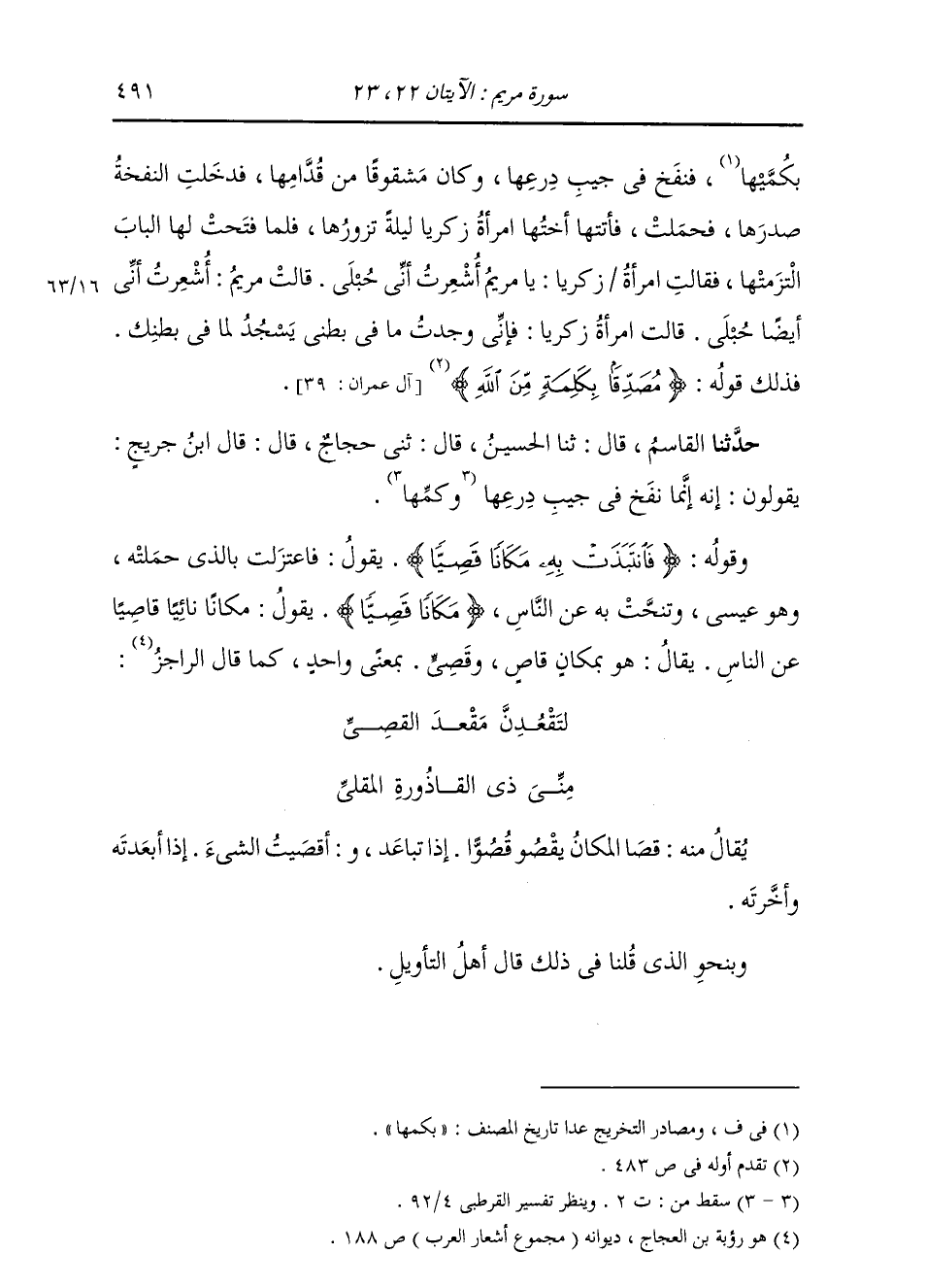 §وَقَوْلُهُ: {فَانْتَبَذَتْ بِهِ مَكَانًا قَصِيًّا} [مريم: 22] يَقُولُ: فَاعْتَزَلْتُ بِالَّذِي حَمَلْتَهُ، وَهُوَ عِيسَى، وَتَنَحَّتْ بِهِ عَنِ النَّاسِ {مَكَانًا قَصِيًّا} [مريم: 22] يَقُولُ: مَكَانًا نَائِيًا قَاصِيًا عَنِ النَّاسِ، يُقَالُ: هُوَ بِمَكَانٍ قَاصٍ، وَقَصِيٍّ بِمَعْنًى وَاحِدٍ، كَمَا قَالَ الرَّاجِزُ: