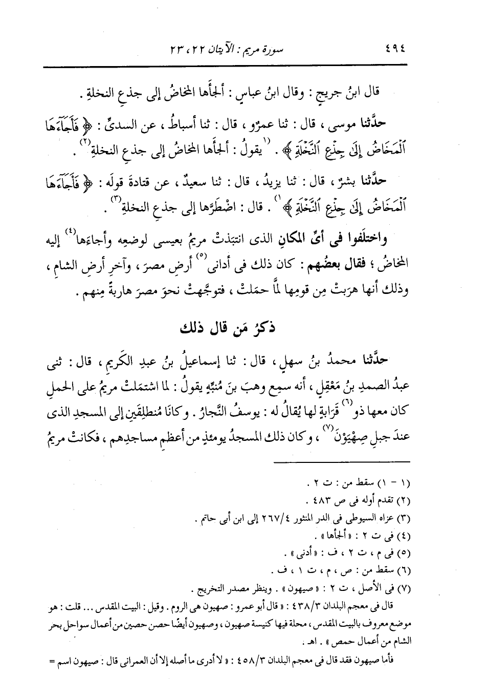 حَدَّثَنَا بِشْرٌ، قَالَ: ثنا يَزِيدُ، قَالَ: ثنا سَعِيدٌ، عَنْ قَتَادَةَ، قَوْلُهُ: {§فَأَجَاءَهَا الْمَخَاضُ إِلَى جِذْعِ النَّخْلَةِ} [مريم: 23] قَالَ: اضْطَرَّهَا إِلَى جِذْعِ النَّخْلَةِ وَاخْتَلَفُوا فِي أَيِّ الْمَكَانِ الَّذِي انْتَبَذَتْ مَرْيَمُ بِعِيسَى لِوَضْعِهِ، وَأَجَاءَهَا إِلَيْهِ الْمَخَاضُ، فَقَالَ بَعْضُهُمْ: كَانَ ذَلِكَ فِي أَدْنَى أَرْضِ مِصْرَ، وَآخَرُ: أَرْضُ الشَّامِ، وَذَلِكَ أَنَّهَا هَرَبَتْ مِنْ قَوْمِهَا لَمَّا حَمَلَتْ، فَتَوَجَّهَتْ نَحْوَ مِصْرَ هَارِبَةً مِنْهُمْ
