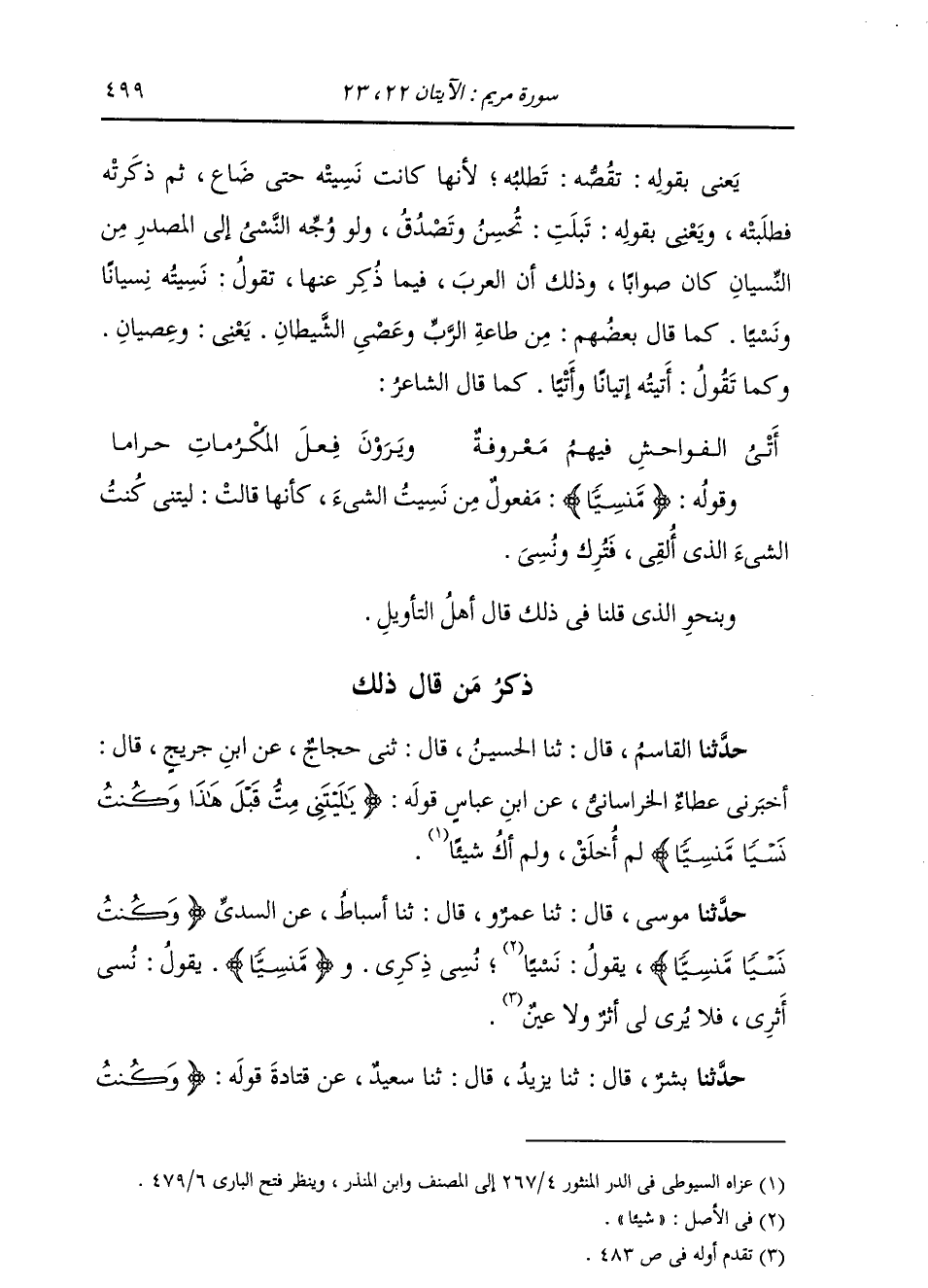 حَدَّثَنَا مُوسَى، قَالَ: ثنا عَمْرٌو، قَالَ: ثنا أَسْبَاطٌ، عَنِ السُّدِّيِّ، {§وَكُنْتُ نَسْيًا مَنْسِيًّا} [مريم: 23] يَقُولُ: نَسْيًا: نُسِيَ ذِكْرِي، وَمَنْسِيًّا: تَقُولُ: نُسِيَ أَثَرِي، فَلَا يُرَى لِي أَثَرٌ وَلَا عَيْنٌ