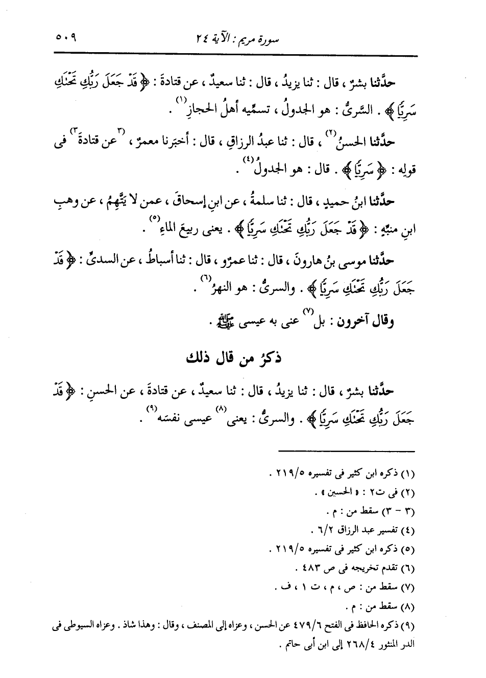ذِكْرُ مَنْ قَالَ ذَلِكَ: حَدَّثَنَا بِشْرٌ، قَالَ: ثنا يَزِيدُ، قَالَ: ثنا سَعِيدٌ، عَنْ قَتَادَةَ، عَنِ الْحَسَنِ، {§قَدْ جَعَلَ رَبُّكِ تَحْتَكِ سَرِيًّا} [مريم: 24] وَالسَّرِيُّ: عِيسَى نَفْسُهُ
