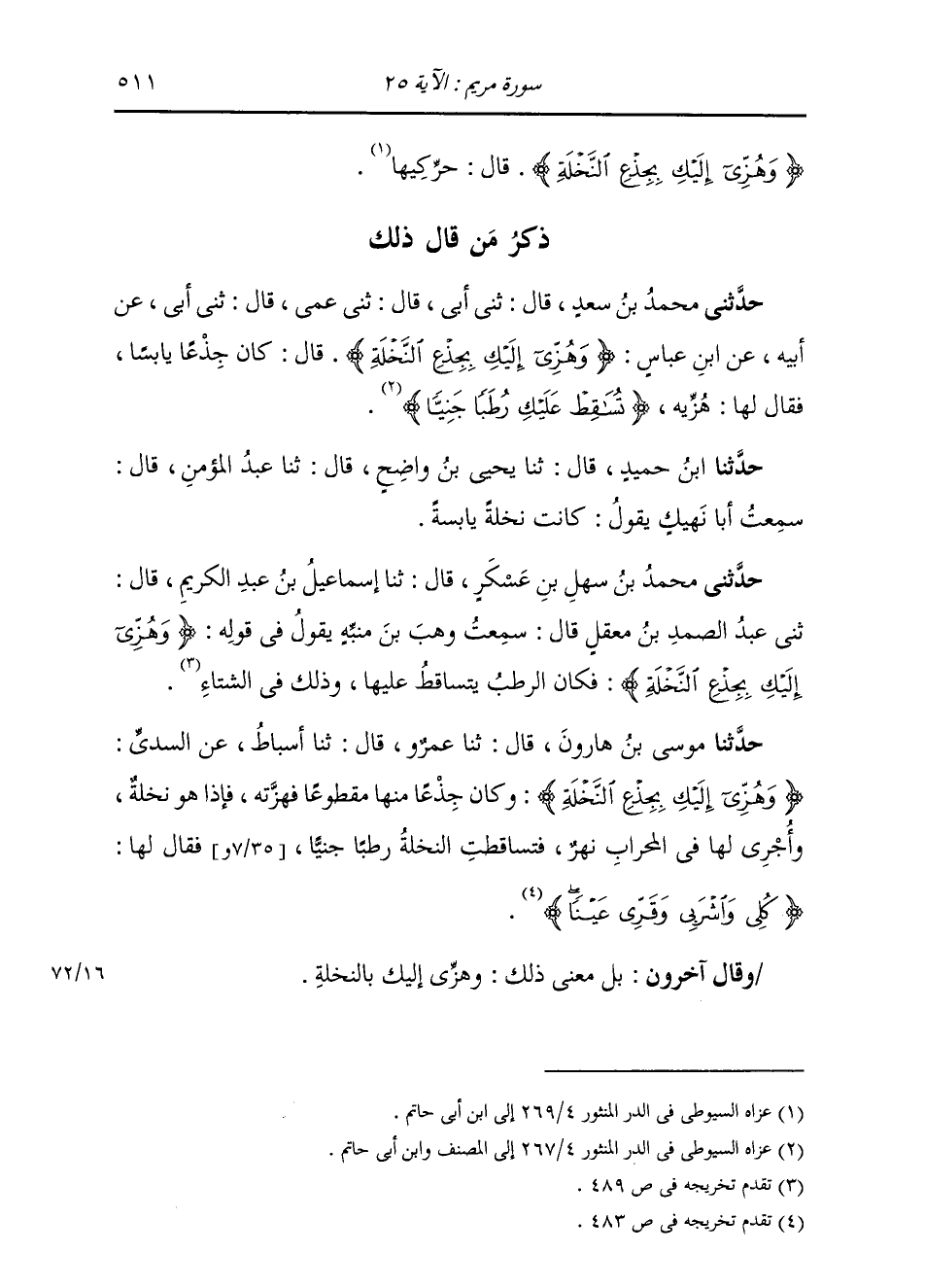 حَدَّثَنَا مُوسَى بْنُ هَارُونَ، قَالَ: ثنا عَمْرٌو، قَالَ: ثنا أَسْبَاطٌ، عَنِ السُّدِّيِّ، {§وَهُزِّي إِلَيْكِ بِجِذْعِ النَّخْلَةِ} [مريم: 25] وَكَانَ جِذْعًا مِنْهَا مَقْطُوعًا فَهَزَّتْهُ، فَإِذَا هُوَ نَخْلَةٌ، وَأُجْرِيَ لَهَا فِي الْمِحْرَابِ نَهْرٌ، فَتَسَاقَطَتِ النَّخْلَةُ رُطَبًا جَنِيًّا فَقَالَ لَهَا: {كُلِي وَاشْرَبِي وَقَرِّي عَيْنًا} وَقَالَ آخَرُونَ: بَلْ مَعْنَى ذَلِكَ: وَهُزِّي إِلَيْكِ بِالنَّخْلَةِ