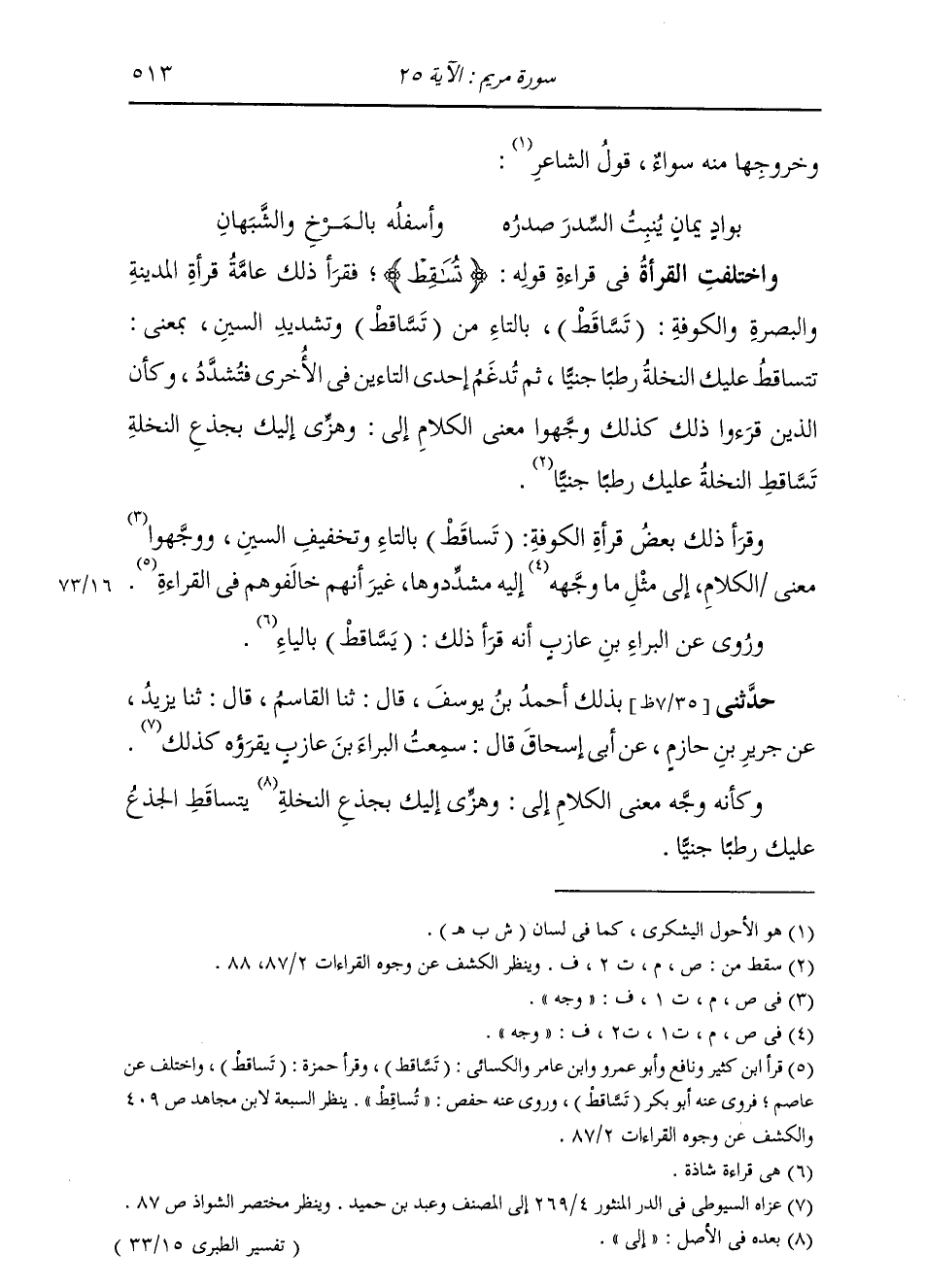 وَاخْتَلَفَ الْقُرَّاءُ فِي قِرَاءَةِ قَوْلِهِ: {تُسَاقِطْ} [مريم: 25] فَقَرَأَ ذَلِكَ عَامَّةُ قُرَّاءِ الْمَدِينَةِ وَالْبَصْرَةِ وَالْكُوفَةِ: (تَسَّاقَطْ) بِالتَّاءِ مِنْ تَسَّاقَطْ وَتَشْدِيدِ السِّينِ، بِمَعْنَى: تَتَسَاقَطُ عَلَيْكِ النَّخْلَةُ رُطَبًا جَنِيًّا، ثُمَّ تُدْغَمُ إِحْدَى التَّاءَيْنِ فِي الْأُخْرَى فَتُشَدَّدُ، وَكَأَنَّ الَّذِينَ قَرَءُوا ذَلِكَ كَذَلِكَ وَجَّهُوا مَعْنَى الْكَلَامِ إِلَى: وَهُزِّي إِلَيْكِ بِجِذْعِ النَّخْلَةِ تَسَّاقَطُ النَّخْلَةُ عَلَيْكِ رُطَبًا. وَقَرَأَ ذَلِكَ بَعْضُ قُرَّاءِ الْكُوفَةِ: (تُسَاقِطْ) بِالتَّاءِ وَتَخْفِيفِ السِّينِ، وَوُجِّهَ مَعْنَى الْكَلَامِ، إِلَى مِثْلِ مَا وَجَّهَ إِلَيْهِ مُشَدِّدُوهَا، غَيْرَ أَنَّهُمْ خَالَفُوهُمْ فِي الْقِرَاءَةِ