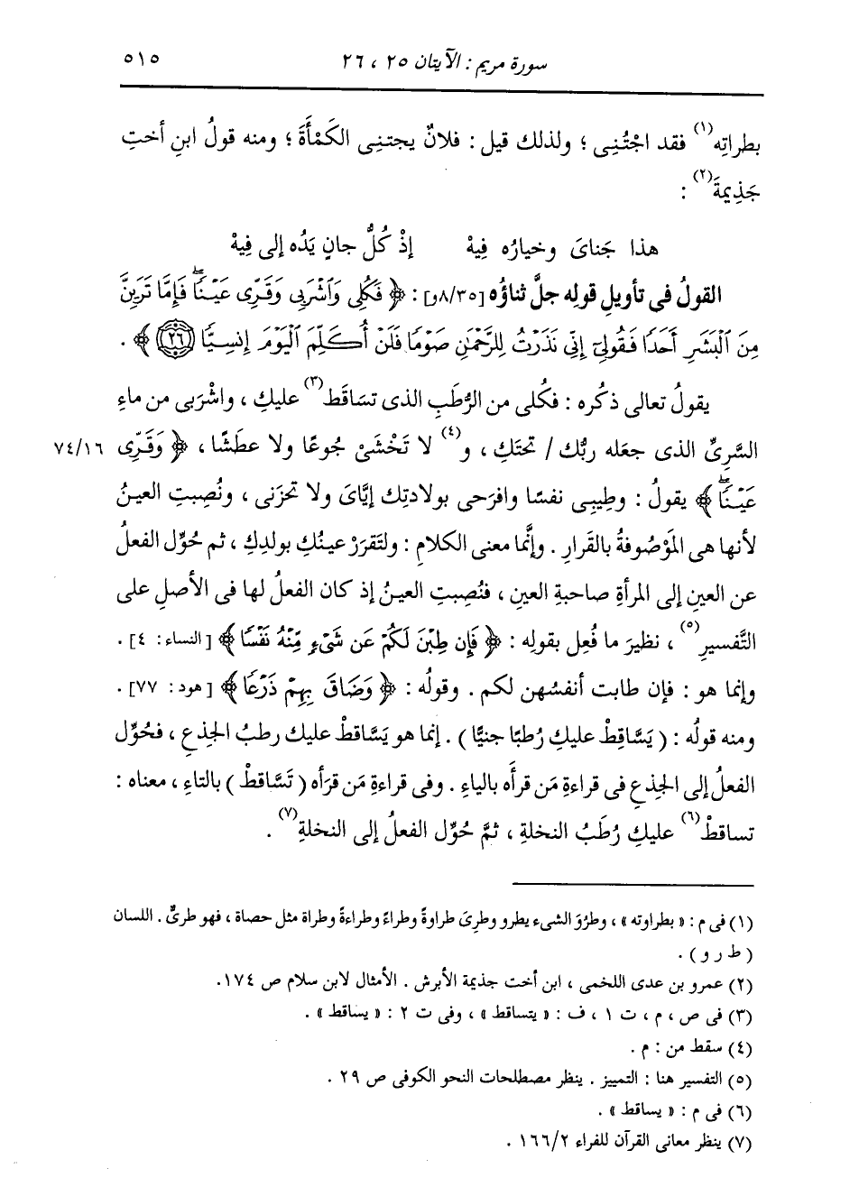 §الْقَوْلُ فِي تَأْوِيلِ قَوْلِهِ تَعَالَى: {فَكُلِي وَاشْرَبِي وَقَرِّي عَيْنًا فَإِمَّا تَرَيِنَّ مِنَ الْبَشَرِ أَحَدًا فَقُولِي إِنِّي نَذَرْتُ لِلرَّحْمَنِ صَوْمًا فَلَنْ أُكَلِّمَ الْيَوْمَ إِنْسِيًّا} [مريم: 26] يَقُولُ تَعَالَى ذِكْرُهُ: فَكُلِي مِنَ الرُّطَبِ الَّذِي يَتَسَاقَطُ عَلَيْكِ، وَاشْرَبِي مِنْ مَاءِ السَّرِيِّ الَّذِي جَعَلَهُ رَبُّكِ تَحْتَكِ، لَا تَخْشَيْ جُوعًا وَلَا عَطَشًا {وَقُرِّي عَيْنًا} [مريم: 26] يَقُولُ: وَطِيبِي نَفْسًا وَافْرَحِي بِوِلَادَتِكِ إِيَّايَ وَلَا تَحْزَنِي. وَنُصِبَتِ الْعَيْنُ لِأَنَّهَا هِيَ الْمَوْصُوفَةُ بِالْقَرَارِ. وَإِنَّمَا مَعْنَى الْكَلَامِ: وَلْتَقْرُرْ عَيْنُكِ بِوَلَدِكِ، ثُمَّ حُوِّلَ الْفِعْلُ عَنِ الْعَيْنِ إِلَى الْمَرْأَةِ صَاحِبَةِ الْعَيْنِ، فَنُصِبَتِ الْعَيْنُ إِذْ كَانَ الْفِعْلُ لَهَا فِي الْأَصْلِ عَلَى التَّفْسِيرِ، نَظِيرُ مَا فُعِلَ بِقَوْلِهِ: {فَإِنْ طَبْنَ لَكُمْ عَنْ شَيْءٍ مِنْهُ نَفْسًا} [النساء: 4] وَإِنَّمَا هُوَ: فَإِنْ طَابَتْ أَنْفُسُهُنَّ لَكُمْ. وَقَوْلُهُ: {وَضَاقَ بِهِمْ ذَرْعًا} [هود: 77] وَمِنْهُ قَوْلُهُ: «يَسَّاقَطُ عَلَيْكِ رُطَبًا جَنِيًّا» إِنَّمَا هُوَ يَسَّاقَطُ عَلَيْكِ رُطَبُ الْجِذْعِ، فَحَوَّلَ الْفِعْلَ إِلَى الْجِذْعِ، فِي قِرَاءَةِ مَنْ قَرَأَهُ بِالْيَاءِ. وَفِي قِرَاءَةِ مَنْ قَرَأَهُ: {تَسَّاقَطْ} [مريم: 25] بِالتَّاءِ، مَعْنَاهُ: يَسَّاقَطُ عَلَيْكِ رُطَبُ النَّخْلَةِ، ثُمَّ حُوِّلَ الْفِعْلُ إِلَى النَّخْلَةِ.