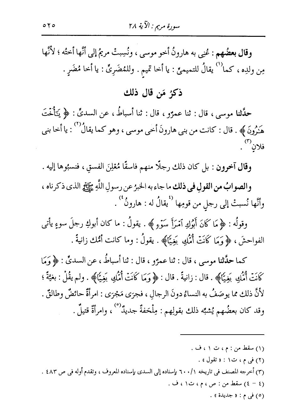 ذِكْرُ مَنْ قَالَ ذَلِكَ: حَدَّثَنَا مُوسَى، قَالَ: ثنا عَمْرٌو، قَالَ: ثنا أَسْبَاطٌ، عَنِ السُّدِّيِّ، {§يَا أُخْتَ هَارُونَ} [مريم: 28] قَالَ: كَانَتْ مِنْ بَنِي هَارُونَ أَخِي مُوسَى، وَهُوَ كَمَا تَقُولُ: يَا أَخَا بَنِي فُلَانٍ وَقَالَ آخَرُونَ: بَلْ كَانَ ذَلِكَ رَجُلًا مِنْهُمْ فَاسِقًا مُعْلِنٌ الْفِسْقَ، فَنَسَبُوهَا إِلَيْهِ. قَالَ أَبُو جَعْفَرٍ: وَالصَّوَابُ مِنَ الْقَوْلِ فِي ذَلِكَ مَا جَاءَ بِهِ الْخَبَرُ عَنْ رَسُولِ اللَّهِ صَلَّى اللهُ عَلَيْهِ وَسَلَّمَ الَّذِي ذَكَرْنَاهُ، وَأَنَّهَا نُسِبَتْ إِلَى رَجُلٍ مِنْ قَوْمِهَا