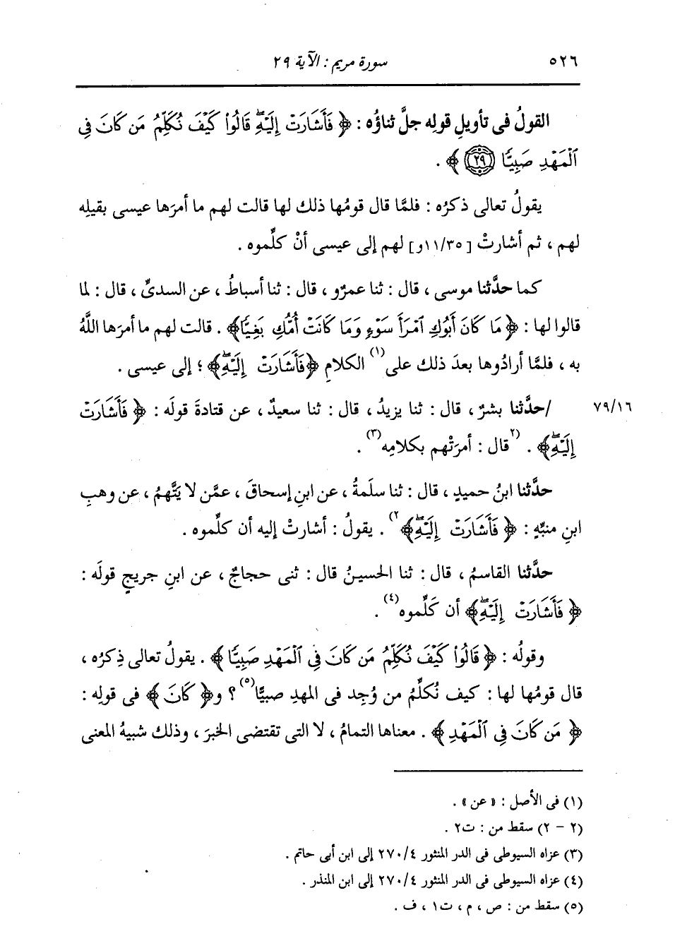 §الْقَوْلُ فِي تَأْوِيلِ قَوْلِهِ تَعَالَى: {فَأَشَارَتْ إِلَيْهِ قَالُوا كَيْفَ نُكَلِّمُ مَنْ كَانَ فِي الْمَهْدِ صَبِيًّا} [مريم: 29] يَقُولُ تَعَالَى ذِكْرُهُ: فَلَمَّا قَالَ قَوْمُهَا ذَلِكَ لَهَا قَالَتْ لَهُمْ مَا أَمَرَهَا عِيسَى بِقِيلِهِ لَهُمْ، ثُمَّ أَشَارَتْ لَهُمْ إِلَى عِيسَى أَنْ كَلِّمُوهُ، كَمَا: