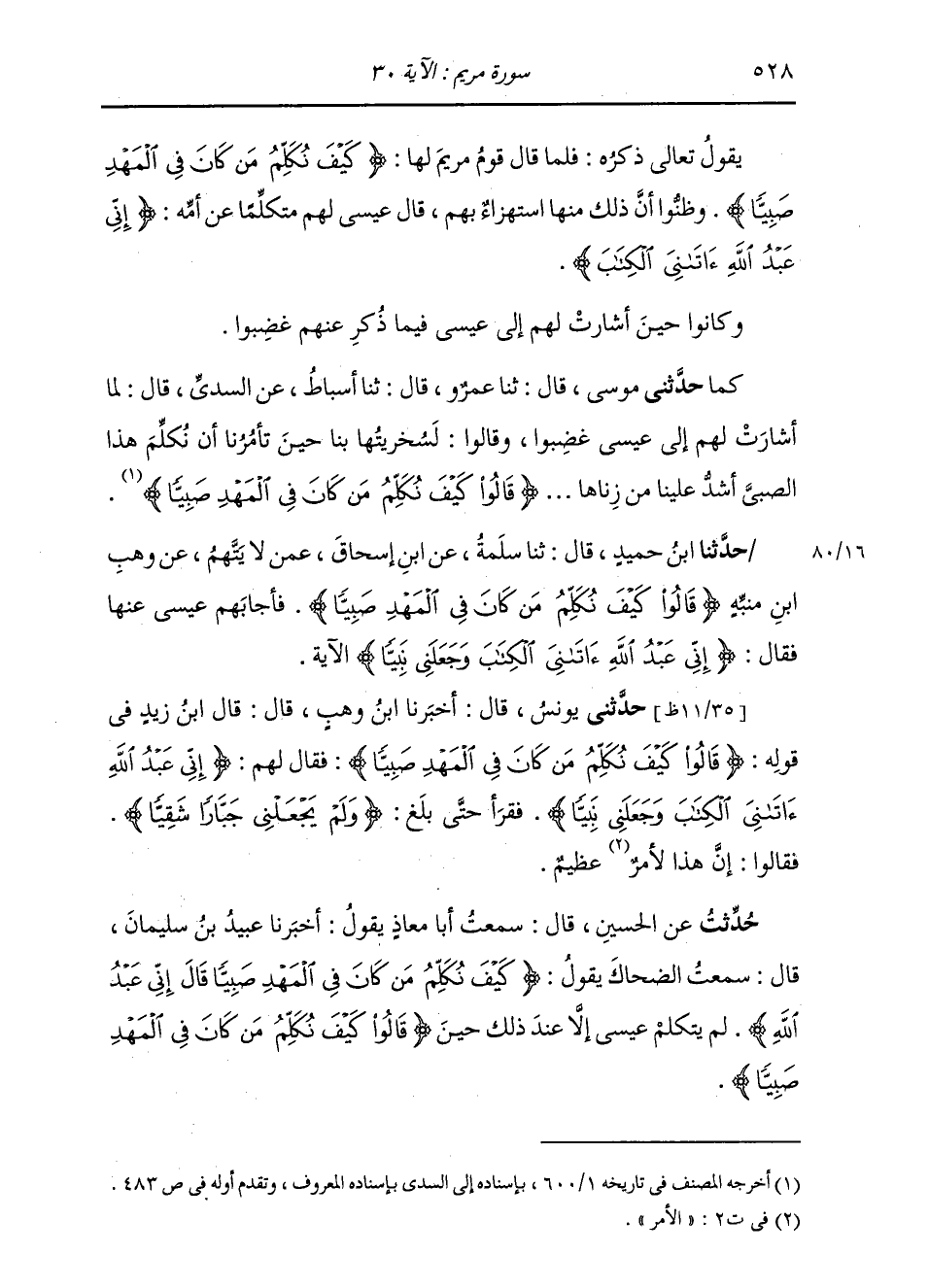 حَدَّثَنَا ابْنُ حُمَيْدٍ، قَالَ: ثنا سَلَمَةُ، عَنِ ابْنِ إِسْحَاقَ، عَمَّنْ لَا يُتَّهَمُ، عَنْ وَهْبِ بْنِ مُنَبِّهٍ، {§قَالُوا كَيْفَ نُكَلِّمُ مَنْ كَانَ فِي الْمَهْدِ صَبِيًّا} [مريم: 29] فَأَجَابَهُمْ عِيسَى عَنْهَا فَقَالَ لَهُمْ {إِنِّي عَبْدُ اللَّهِ آتَانِيَ الْكِتَابَ وَجَعَلَنِي نَبِيًّا} [مريم: 30] . الْآيَةَ