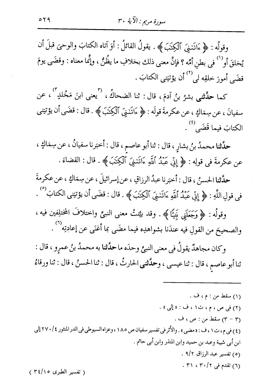 حَدَّثَنِي بِشْرُ بْنُ آدَمَ، قَالَ: ثنا الضَّحَّاكُ، يَعْنِي ابْنَ مَخْلَدٍ، عَنْ سُفْيَانَ، عَنْ سِمَاكٍ، عَنْ عِكْرِمَةَ، قَالَ {§آتَانِيَ الْكِتَابَ} [مريم: 30] قَالَ: قَضَى أَنْ يُؤْتِيَنِيَ الْكِتَابَ فِيمَا مَضَى