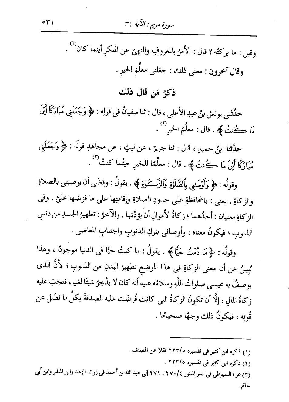 ذِكْرُ مَنْ قَالَ ذَلِكَ: حَدَّثَنِي يُونُسُ بْنُ عَبْدِ الْأَعْلَى، قَالَ: ثنا سُفْيَانُ، فِي قَوْلِهِ {§وَجَعَلَنِي مُبَارَكًا أَيْنَمَا كُنْتُ} قَالَ: مُعَلِّمًا لِلْخَيْرِ