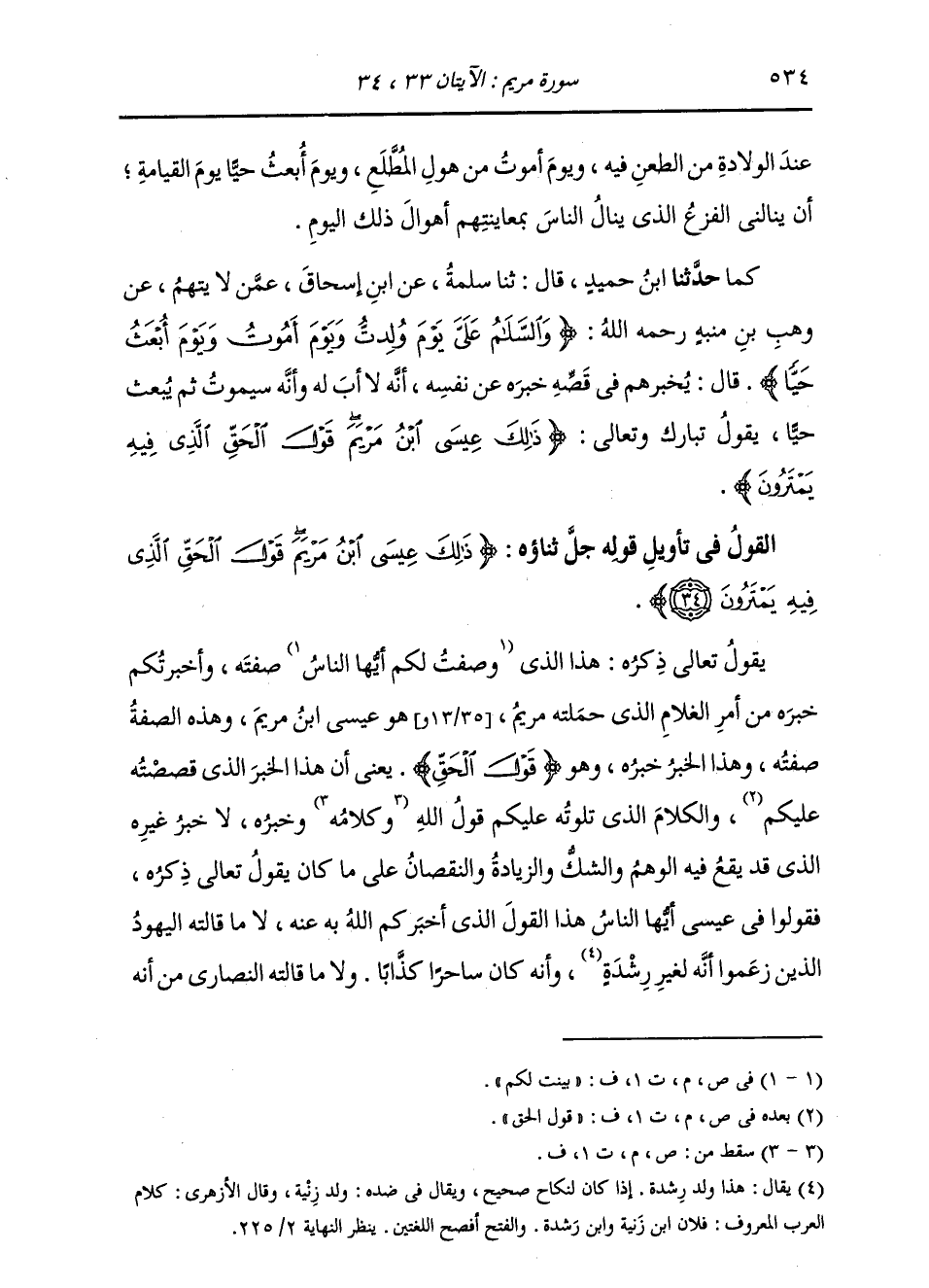 §الْقَوْلُ فِي تَأْوِيلِ قَوْلِهِ تَعَالَى: {ذَلِكَ عِيسَى ابْنُ مَرْيَمَ قَوْلَ الْحَقِّ الَّذِي فِيهِ يَمْتَرُونَ} [مريم: 34] يَقُولُ تَعَالَى ذِكْرُهُ: هَذَا الَّذِي بَيَّنْتُ لَكُمْ صِفَتَهُ، وَأَخْبَرْتُكُمْ خَبَرَهُ، مِنْ أَمْرِ الْغُلَامِ الَّذِي حَمَلَتْهُ مَرْيَمُ، هُوَ عِيسَى ابْنُ مَرْيَمَ، وَهَذِهِ الصُّفَّةُ صِفَتُهُ، وَهَذَا الْخَبَرُ خَبَرُهُ، وَهُوَ {قَوْلُ الْحَقِّ} [مريم: 34] يَعْنِي أَنَّ هَذَا الْخَبَرَ الَّذِي قَصَصْتُهُ عَلَيْكُمْ قَوْلُ الْحَقِّ، وَالْكَلَامُ الَّذِي تَلَوْتُهُ عَلَيْكُمْ قَوْلُ اللَّهِ وَخَبَرُهُ، لَا خَبَرَ غَيْرُهُ، الَّذِي يَقَعُ فِيهِ الْوَهْمُ وَالشَّكُّ، وَالزِّيَادَةُ وَالنُّقْصَانُ، عَلَى مَا كَانَ يَقُولُ اللَّهُ تَعَالَى ذِكْرُهُ: فَقُولُوا فِي عِيسَى أَيُّهَا النَّاسُ هَذَا الْقَوْلَ الَّذِي أَخْبَرَكُمُ اللَّهُ بِهِ عَنْهُ، لَا مَا قَالَتْهُ الْيَهُودُ الَّذِينَ زَعَمُوا أَنَّهُ لِغَيْرِ رِشْدَةٍ، وَأَنَّهُ كَانَ سَاحِرًا كَذَّابًا، وَلَا مَا قَالَتْهُ النَّصَارَى، مِنْ أَنَّهُ