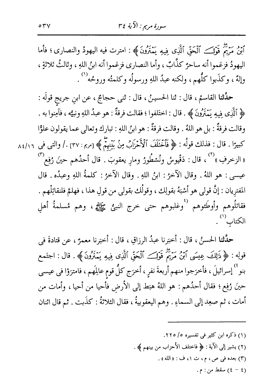حَدَّثَنَا الْقَاسِمُ، قَالَ: ثنا الْحُسَيْنُ، قَالَ: ثني حَجَّاجٌ، عَنِ ابْنِ جُرَيْجٍ، قَوْلُهُ: {§الَّذِي فِيهِ يَمْتَرُونَ} [مريم: 34] قَالَ: اخْتَلَفُوا، فَقَالَتْ فِرْقَةٌ: هُوَ عَبْدُ اللَّهِ وَنَبِيُّهُ، فَآمِنُوا بِهِ، وَقَالَتْ فِرْقَةٌ: بَلْ هُوَ اللَّهُ، وَقَالَتْ فِرْقَةٌ: هُوَ ابْنُ اللَّهِ، تَبَارَكَ وَتَعَالَى عَمَّا يَقُولُونَ عُلُوًّا كَبِيرًا. قَالَ: فَذَلِكَ قَوْلُهُ {فَاخْتَلَفَ الْأَحْزَابُ مِنْ بَيْنِهِمْ} [مريم: 37] وَالَّتِي فِي الزُّخْرُفِ. قَالَ دقيوس وَنسطور وَمار يَعْقُوبُ، قَالَ أَحَدُهُمْ حِينَ رَفَعَ اللَّهُ عِيسَى: هُوَ اللَّهُ، وَقَالَ الْآخَرُ: ابْنُ اللَّهِ، وَقَالَ الْآخَرُ: كَلِمَةُ اللَّهِ وَعَبْدُهُ، فَقَالَ الْمُفْتَرِيَانِ: إِنَّ قَوْلِي هُوَ أَشْبَهُ بِقَوْلِكَ، وَقَوْلُكَ بِقَوْلِي مِنْ قَوْلِ هَذَا، فَهَلُمَّ فَلْنُقَاتِلْهُمْ، فَقَاتَلُوهُمْ وَأَوْطَئُوهُمْ إِسْرَائِيلَ، فَأَخْرَجُوا مِنْهُمْ أَرْبَعَةَ نَفَرٍ، أَخْرَجَ كُلُّ قَوْمٍ عَالِمَهُمْ، فَامْتَرَوْا فِي عِيسَى حِينَ رُفِعَ، فَقَالَ أَحَدُهُمْ: هُوَ اللَّهُ هَبَطَ إِلَى الْأَرْضِ وَأَحْيَا مَنْ أَحْيَا، وَأَمَاتَ مَنْ أَمَاتَ، ثُمَّ صَعِدَ إِلَى السَّمَاءِ، وَهُمُ الْيَعْقُوبِيَّةُ، فَقَالَ الثَّلَاثَةُ: كَذَبْتَ، ثُمَّ قَالَ اثْنَانِ