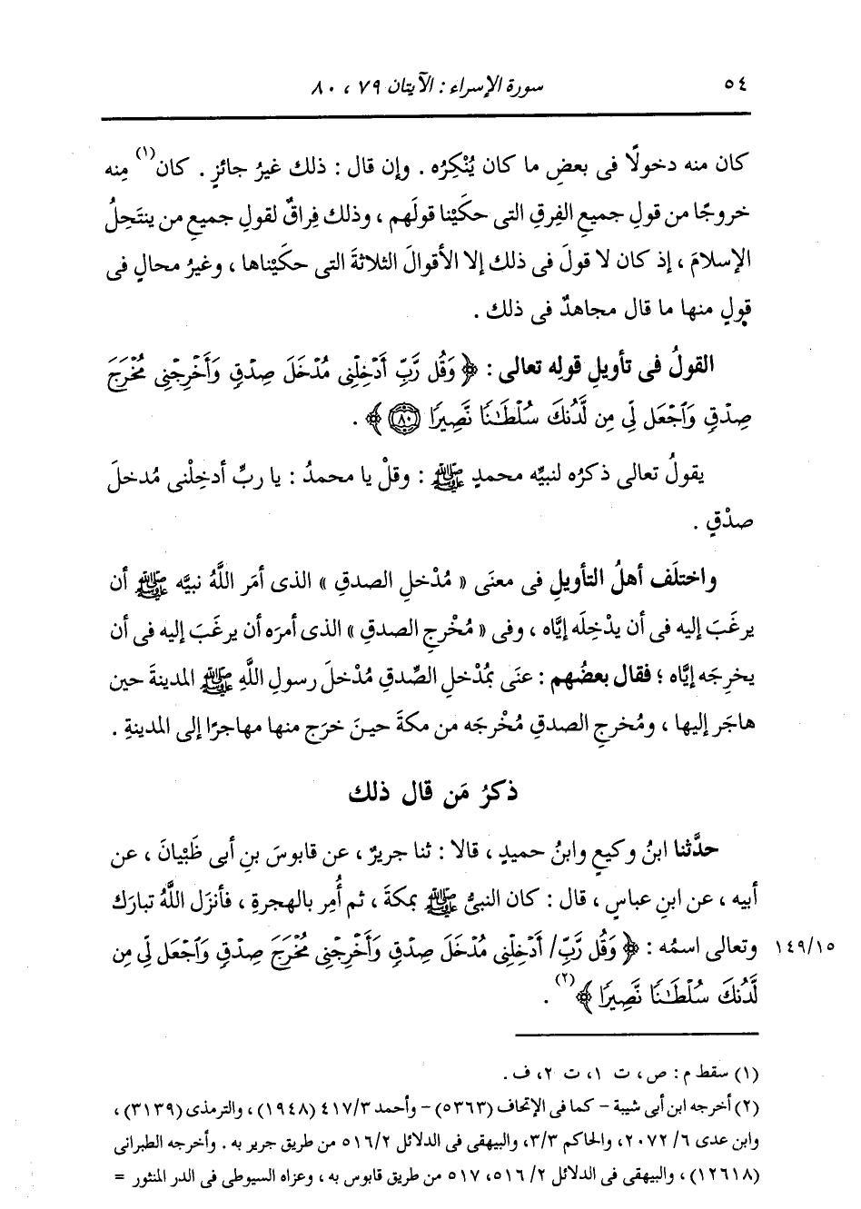 ذِكْرُ مَنْ قَالَ ذَلِكَ: حَدَّثَنَا ابْنُ وَكِيعٍ، وَابْنُ حُمَيْدٍ، قَالَا: ثنا جَرِيرٌ، عَنْ قَابُوسِ بْنِ أَبِي ظَبْيَانَ، عَنْ أَبِيهِ، عَنِ ابْنِ عَبَّاسٍ، قَالَ: كَانَ النَّبِيُّ صَلَّى اللهُ عَلَيْهِ وَسَلَّمَ بِمَكَّةَ، ثُمَّ أُمِرَ بِالْهِجْرَةِ، فَأَنْزَلَ اللَّهُ تَبَارَكَ وَتَعَالَى اسْمُهُ {§وَقُلْ رَبِّ أَدْخِلْنِي مُدْخَلَ صِدْقٍ وَأَخْرِجْنِي مُخْرَجَ صِدْقٍ وَاجْعَلْ لِي مِنْ لَدُنْكَ سُلْطَانًا نَصِيرًا} [الإسراء: 80]