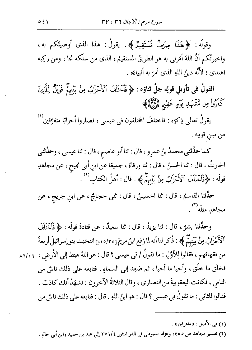 حَدَّثَنِي مُحَمَّدُ بْنُ عَمْرٍو، قَالَ: ثنا أَبُو عَاصِمٍ، قَالَ: ثنا عِيسَى، وَحَدَّثَنِي الْحَارِثُ، قَالَ: ثني الْحَسَنُ، قَالَ: ثنا وَرْقَاءُ، جَمِيعًا عَنِ ابْنِ أَبِي نَجِيحٍ، عَنْ مُجَاهِدٍ، قَوْلُهُ: {§فَاخْتَلَفَ الْأَحْزَابُ مِنْ بَيْنِهِمْ} [مريم: 37] قَالَ: أَهْلُ الْكِتَابِ حَدَّثَنَا الْقَاسِمُ، قَالَ: ثنا الْحُسَيْنُ، قَالَ: ثني حَجَّاجٌ، عَنِ ابْنِ جُرَيْجٍ، عَنْ مُجَاهِدٍ، مِثْلَهُ