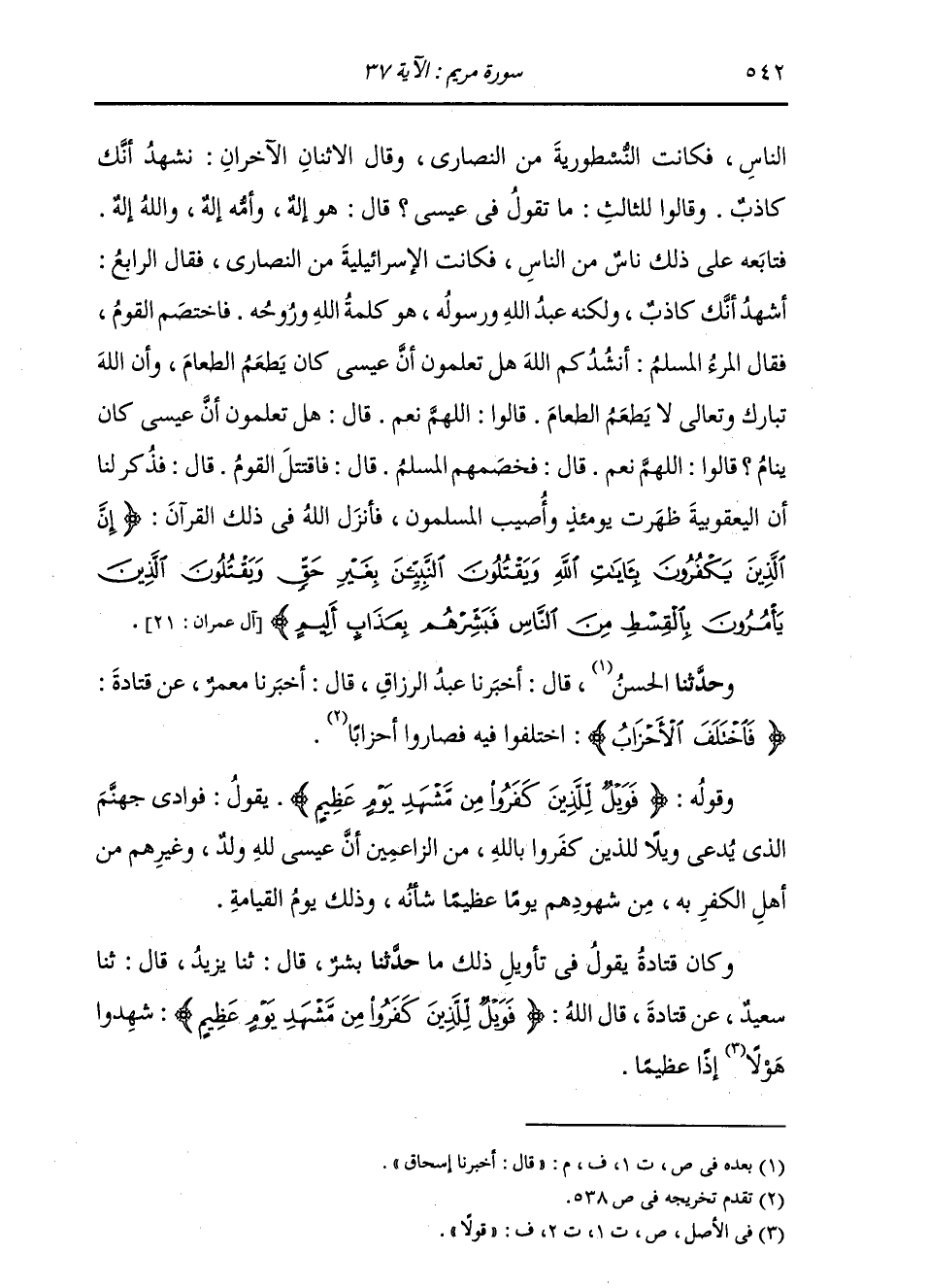 §وَقَوْلُهُ: {فَوَيْلٌ لِلَّذِينَ كَفَرُوا مِنْ مَشْهَدِ يَوْمٍ عَظِيمٍ} [مريم: 37] يَقُولُ: فَوَادِي جَهَنَّمَ الَّذِي يُدْعَى وَيْلًا لِلَّذِينَ كَفَرُوا بِاللَّهِ، مِنَ الزَّاعِمِينَ أَنَّ عِيسَى لِلَّهِ وَلَدٌ، وَغَيْرِهِمْ مِنْ أَهْلِ الْكُفْرِ بِهِ مِنْ شُهُودِهِمْ يَوْمًا عَظِيمًا شَأْنُهُ، وَذَلِكَ يَوْمَ الْقِيَامَةِ. وَكَانَ قَتَادَةُ يَقُولُ فِي تَأْوِيلِ ذَلِكَ مَا: