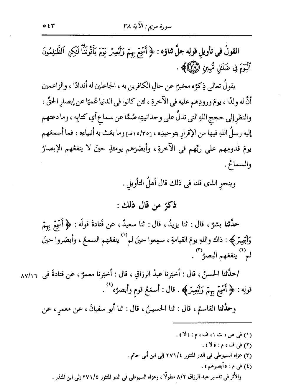 حَدَّثَنَا الْقَاسِمُ، قَالَ: ثنا الْحُسَيْنُ، قَالَ: ثنا أَبُو سُفْيَانَ، عَنْ مَعْمَرٍ، عَنْ -[544]- قَتَادَةَ، قَالَ {§أَسْمِعْ بِهِمْ وَأَبْصِرْ يَوْمَ يَأْتُونَنَا} [مريم: 38] يَوْمَ الْقِيَامَةِ