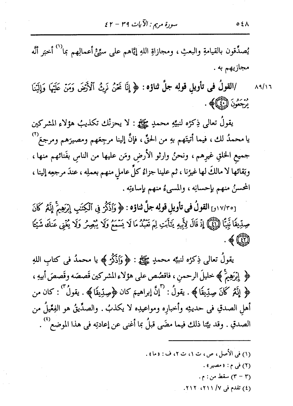 §الْقَوْلُ فِي تَأْوِيلِ قَوْلِهِ تَعَالَى: {إِنَّا نَحْنُ نَرِثُ الْأَرْضَ وَمَنْ عَلَيْهَا وَإِلَيْنَا يُرْجَعُونَ} [مريم: 40] يَقُولُ تَعَالَى ذِكْرُهُ لِنَبِيِّهِ مُحَمَّدٍ صَلَّى اللهُ عَلَيْهِ وَسَلَّمَ: لَا يَحْزُنْكَ تَكْذِيبُ هَؤُلَاءِ الْمُشْرِكِينَ لَكَ يَا مُحَمَّدُ فِيمَا أَتَيْتَهُمْ بِهِ مِنَ الْحَقِّ، فَإِنَّ إِلَيْنَا مَرْجِعَهُمْ وَمَصِيرَهُمْ وَمَصِيرِ جَمِيعِ الْخَلْقِ غَيْرِهِمْ، وَنَحْنُ وَارِثُو الْأَرْضِ وَمَنَ عَلَيْهَا مِنَ النَّاسِ، بِفَنَائِهِمْ مِنْهَا، وَبَقَائِهَا لَا مَالِكَ لَهَا غَيْرُنَا، ثُمَّ عَلَيْنَا جَزَاءُ كُلِّ عَامِلٍ مِنْهُمْ بِعَمَلِهِ، عِنْدَ مَرْجِعِهِ إِلَيْنَا، الْمُحْسِنُ مِنْهُمْ بِإِحْسَانِهِ، وَالْمُسِيءُ بِإِسَاءَتِهِ