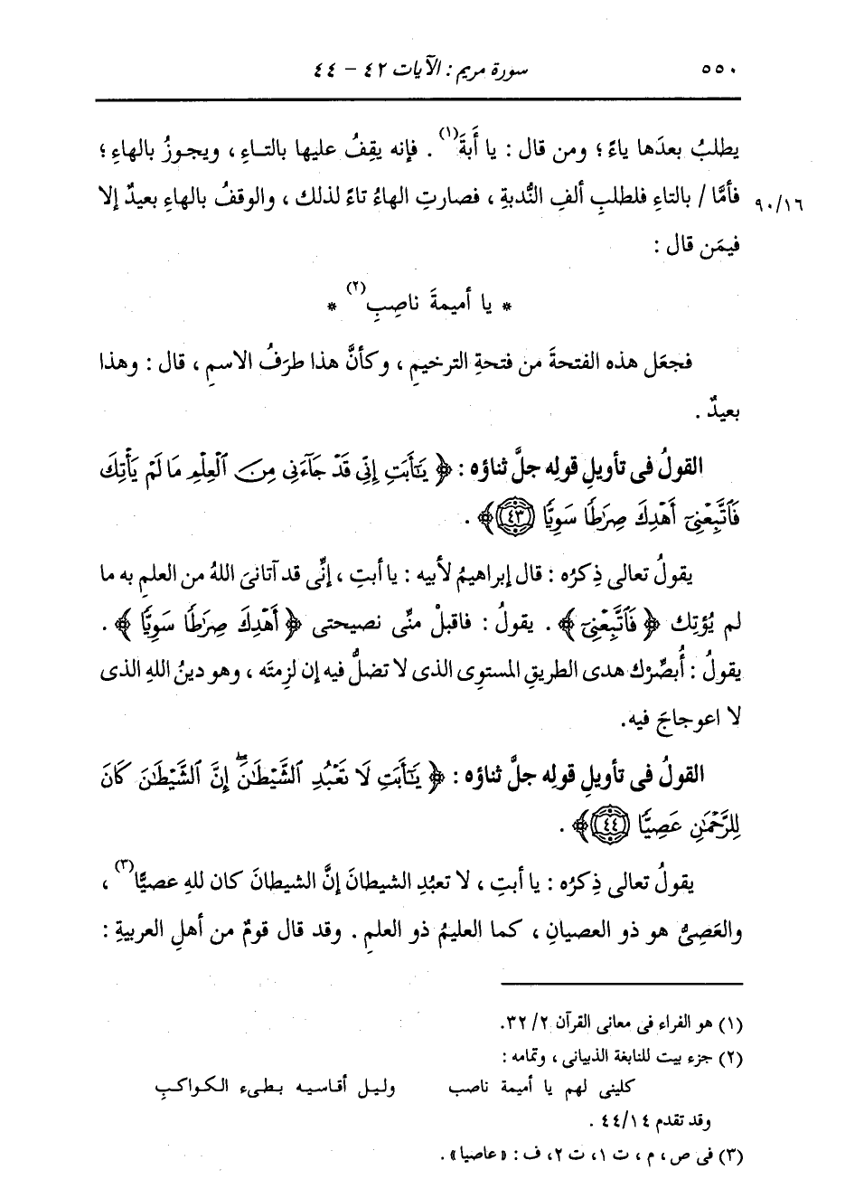 §الْقَوْلُ فِي تَأْوِيلِ قَوْلِهِ تَعَالَى: {يَا أَبَتِ لَا تَعْبُدِ الشَّيْطَانَ إِنَّ الشَّيْطَانَ كَانَ لِلرَّحْمَنِ عَصِيًّا} [مريم: 44] يَقُولُ تَعَالَى ذِكْرُهُ: يَا أَبَتِ لَا تَعْبُدِ الشَّيْطَانَ إِنَّ الشَّيْطَانَ كَانَ لِلَّهِ عَاصِيًا. وَالْعَصِيُّ هُوَ ذُو الْعِصْيَانِ، كَمَا الْعَلِيمُ ذُو الْعِلْمِ. وَقَدْ قَالَ قَوْمٌ مِنْ أَهْلِ الْعَرَبِيَّةِ: -[551]- الْعِصِيُّ: هُوَ الْعَاصِي، وَالْعَلِيمُ هُوَ الْعَالِمُ، وَالْعَرِيفُ هُوَ الْعَارِفُ، وَاسْتَشْهَدُوا لِقَوْلِهِمْ ذَلِكَ، بِقَوْلِ طَرِيفِ بْنِ تَمِيمٍ الْعَنْبَرِيِّ.