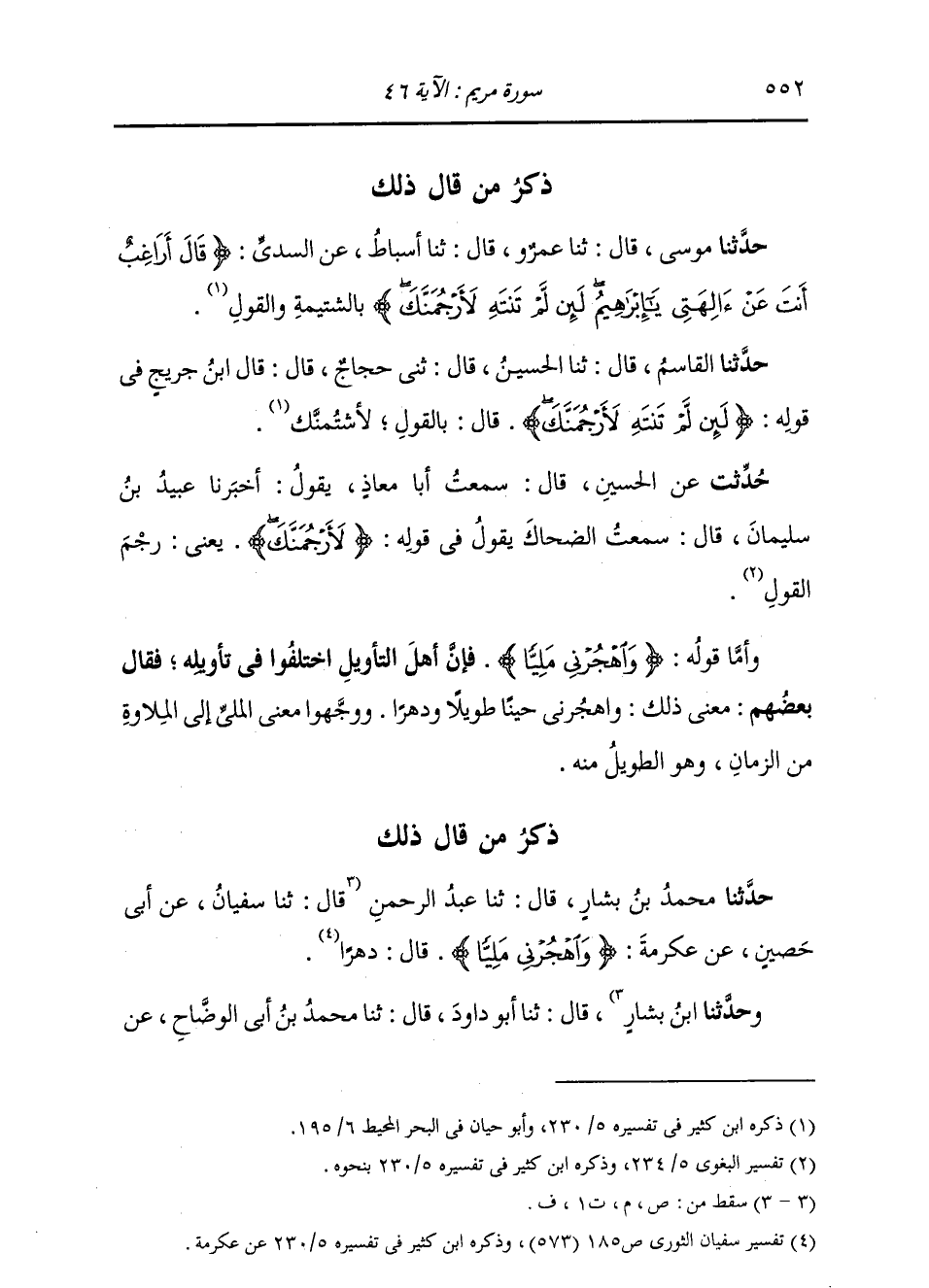 حُدِّثْتُ عَنِ الْحُسَيْنِ، قَالَ: سَمِعْتُ أَبَا مُعَاذٍ، يَقُولُ: أَخْبَرَنَا عُبَيْدُ بْنُ سُلَيْمَانَ، قَالَ: سَمِعْتُ الضَّحَّاكَ، يَقُولُ فِي قَوْلِهِ: {§لَأَرْجُمَنَّكَ} [مريم: 46] يَعْنِي: رَجْمَ الْقَوْلِ