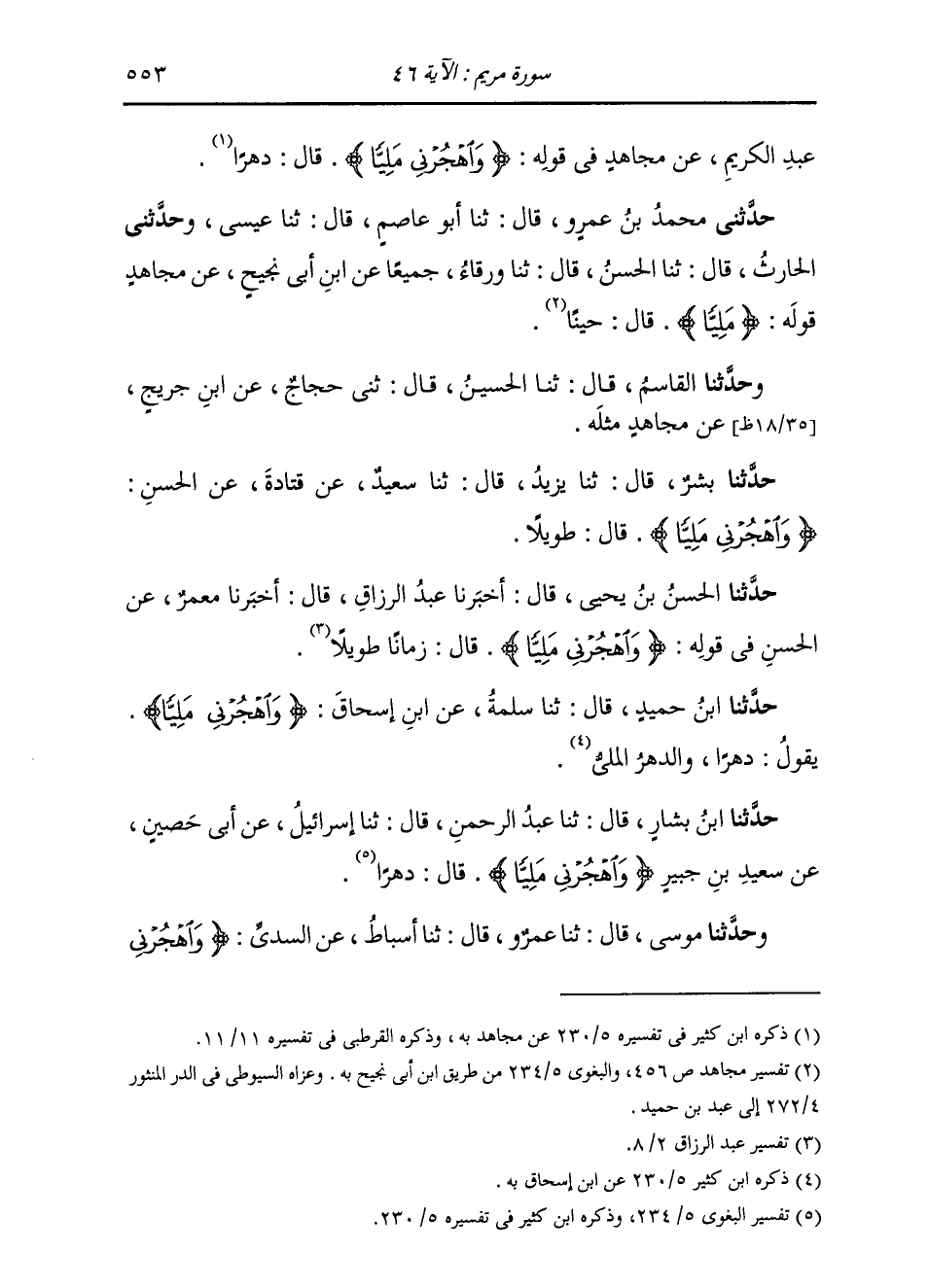 حَدَّثَنَا ابْنُ بَشَّارٍ، قَالَ: ثنا عَبْدُ الرَّحْمَنِ، قَالَ: ثنا إِسْرَائِيلُ، عَنْ أَبِي حُصَيْنٍ، عَنْ سَعِيدِ بْنِ جُبَيْرٍ، {§وَاهْجُرْنِي مَلِيًّا} [مريم: 46] قَالَ دَهْرًا