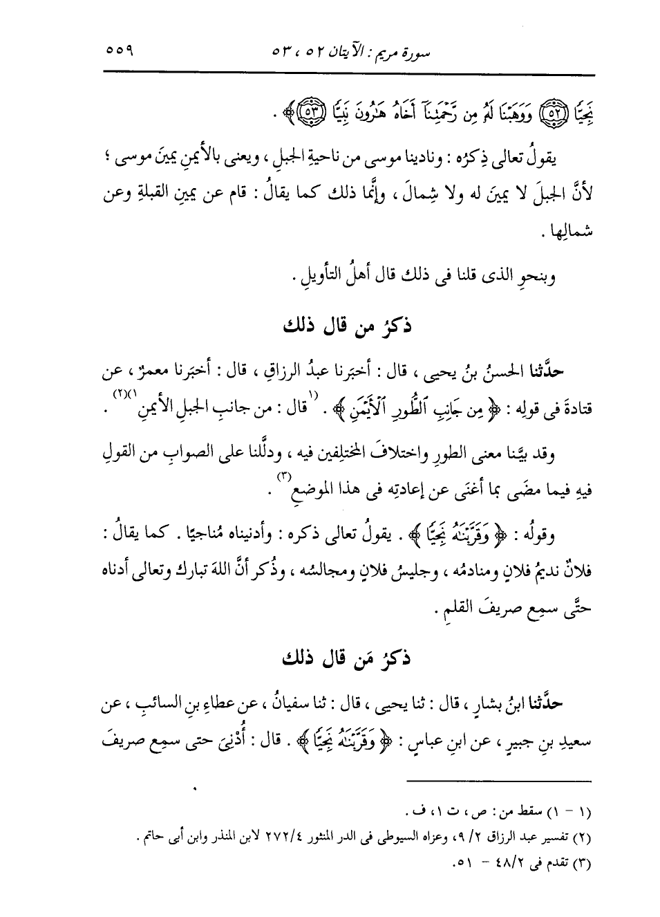 ذِكْرُ مَنْ قَالَ ذَلِكَ: حَدَّثَنَا الْحَسَنُ بْنُ يَحْيَى، قَالَ: أَخْبَرَنَا عَبْدُ الرَّزَّاقِ، قَالَ: أَخْبَرَنَا مَعْمَرٌ، عَنْ قَتَادَةَ، فِي قَوْلِهِ: {§مِنْ جَانِبِ الطُّورِ الْأَيْمَنِ} [مريم: 52] قَالَ: جَانِبُ الْجَبَلِ الْأَيْمَنُ وَقَدْ بَيَّنَّا مَعْنَى الطُّورِ وَاخْتِلَافِ الْمُخْتَلِفِينَ فِيهِ، وَدَلَّلْنَا عَلَى الصَّوَابِ مِنَ الْقَوْلِ فِيمَا مَضَى بِمَا أَغْنَى عَنْ إِعَادَتِهِ فِي هَذَا الْمَوْضِعِ