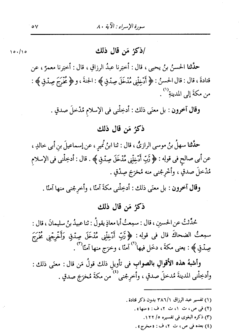 ذِكْرُ مَنْ قَالَ ذَلِكَ: حَدَّثَنَا الْحَسَنُ بْنُ يَحْيَى، قَالَ: أَخْبَرَنَا عَبْدُ الرَّزَّاقِ، قَالَ: أَخْبَرَنَا مَعْمَرٌ، عَنْ قَتَادَةَ، قَالَ: قَالَ الْحَسَنُ: {§أَدْخِلْنِي مُدْخَلَ صِدْقٍ} [الإسراء: 80] الْجَنَّةَ، وَ {مُخْرَجَ صِدْقٍ} [الإسراء: 80] مِنْ مَكَّةَ إِلَى الْمَدِينَةِ وَقَالَ آخَرُونَ: بَلْ مَعْنَى ذَلِكَ: أَدْخِلْنِي فِي الْإِسْلَامِ مُدْخَلَ صِدْقٍ