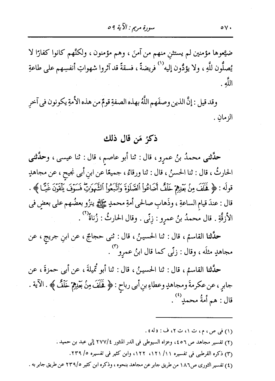 حَدَّثَنِي مُحَمَّدُ بْنُ عَمْرٍو، قَالَ: ثنا أَبُو عَاصِمٍ، قَالَ: ثنا عِيسَى، وَحَدَّثَنِي الْحَارِثُ، قَالَ: ثنا الْحَسَنُ، قَالَ: ثنا وَرْقَاءُ، جَمِيعًا عَنِ ابْنِ أَبِي نَجِيحٍ، عَنْ مُجَاهِدٍ، قَوْلُهُ: {§فَخَلَفَ مِنْ بَعْدِهِمْ خَلْفٌ أَضَاعُوا الصَّلَاةَ وَاتَّبَعُوا الشَّهَوَاتِ فَسَوْفَ يَلْقَوْنَ غَيًّا} [مريم: 59] قَالَ: عِنْدَ قِيَامِ السَّاعَةِ، وَذِهَابِ صَالِحِي أُمَّةِ مُحَمَّدٍ صَلَّى اللهُ عَلَيْهِ وَسَلَّمَ يَنْزُو بَعْضُهُمْ عَلَى بَعْضٍ فِي الْأَزِقَّةِ قَالَ مُحَمَّدُ بْنُ عَمْرٍو: زِنًا. وَقَالَ الْحَارِثُ: زُنَاةٌ حَدَّثَنَا الْقَاسِمُ، قَالَ: ثنا الْحُسَيْنُ، قَالَ: ثني حَجَّاجٌ، عَنِ ابْنِ جُرَيْجٍ، عَنْ مُجَاهِدٍ مِثْلَهُ، وَقَالَ: زِنًا، كَمَا قَالَ ابْنُ عَمْرِو