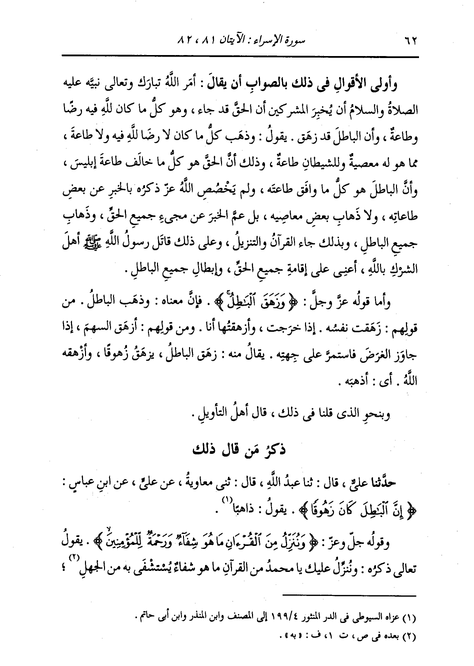 ذِكْرُ مَنْ قَالَ ذَلِكَ: حَدَّثَنَا عَلِيٌّ، قَالَ: ثنا عَبْدُ اللَّهِ، قَالَ: ثني مُعَاوِيَةُ، عَنْ عَلِيٍّ، عَنِ ابْنِ عَبَّاسٍ، {§إِنَّ الْبَاطِلَ كَانَ زَهُوقًا} [الإسراء: 81] يَقُولُ: ذَاهِبًا