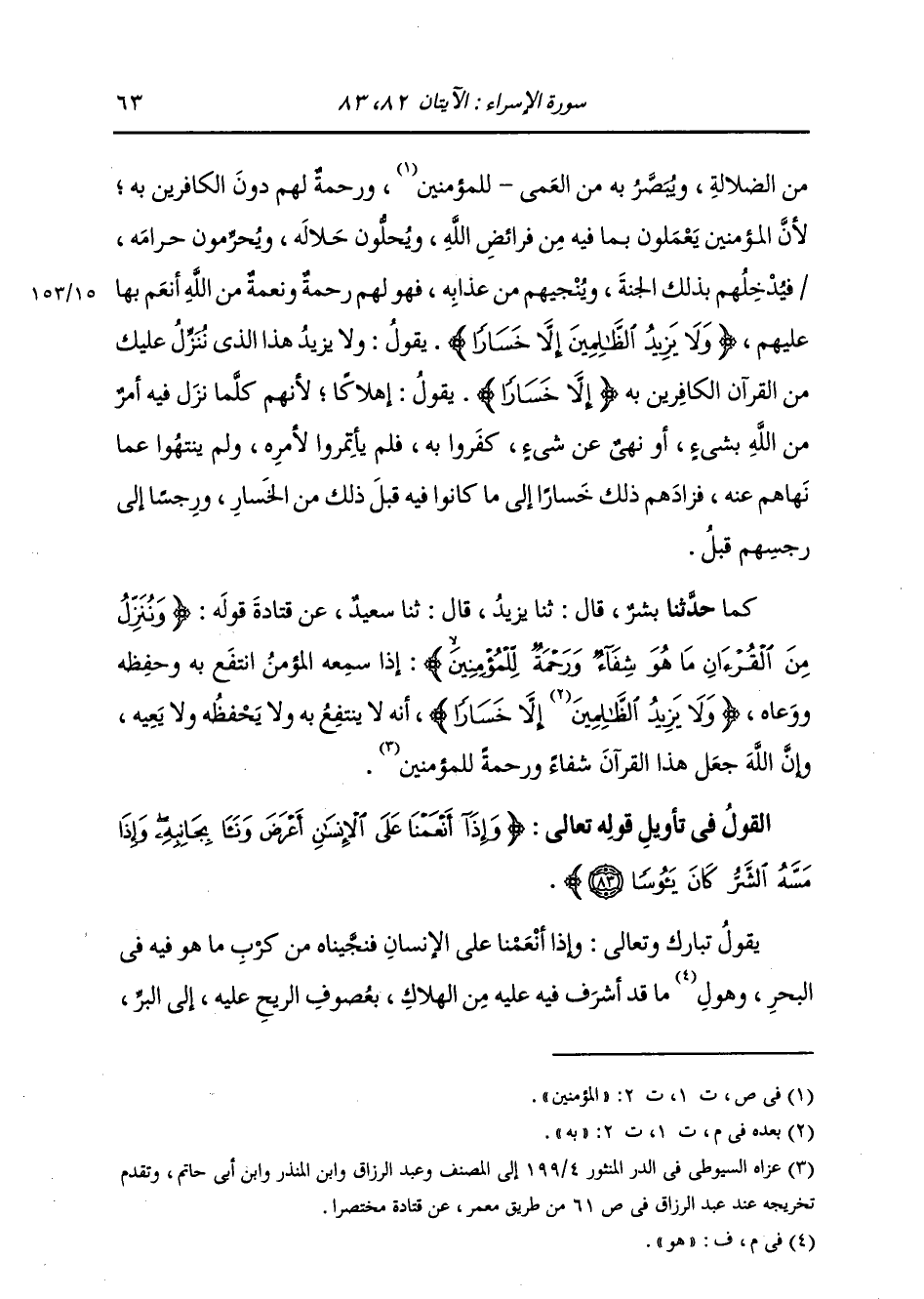حَدَّثَنَا بِشْرٌ، قَالَ: ثنا يَزِيدُ، قَالَ: ثنا سَعِيدٌ، عَنْ قَتَادَةَ، قَوْلُهُ: {§وَنُنَزِّلُ مِنَ الْقُرْآنِ مَا هُوَ شِفَاءٌ وَرَحْمَةٌ لِلْمُؤْمِنِينَ} [الإسراء: 82] إِذَا سَمِعَهُ الْمُؤْمِنُ انْتَفَعَ بِهِ وَحَفِظَهُ وَوَعَاهُ {وَلَا يَزِيدُ الظَّالِمِينَ} [الإسراء: 82] بِهِ {إِلَّا خَسَارًا} [الإسراء: 82] أَنَّهُ لَا يَنْتَفِعُ بِهِ وَلَا يَحْفَظُهُ وَلَا يَعِيهِ، وَإِنَّ اللَّهَ جَعَلَ هَذَا الْقُرْآنَ شِفَاءً وَرَحْمَةً لِلْمُؤْمِنِينَ