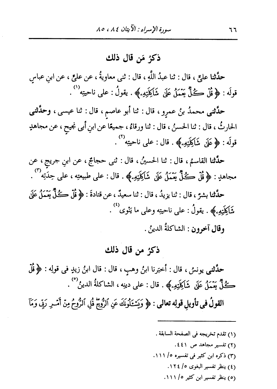 ذِكْرُ مَنْ قَالَ ذَلِكَ: حَدَّثَنَا عَلِيٌّ، قَالَ: ثنا عَبْدُ اللَّهِ، قَالَ: ثني مُعَاوِيَةُ، عَنْ عَلِيٍّ، عَنِ ابْنِ عَبَّاسٍ، قَوْلُهُ: {§كُلٌّ يَعْمَلُ عَلَى شَاكِلَتِهِ} [الإسراء: 84] يَقُولُ: عَلَى نَاحِيَتِهِ