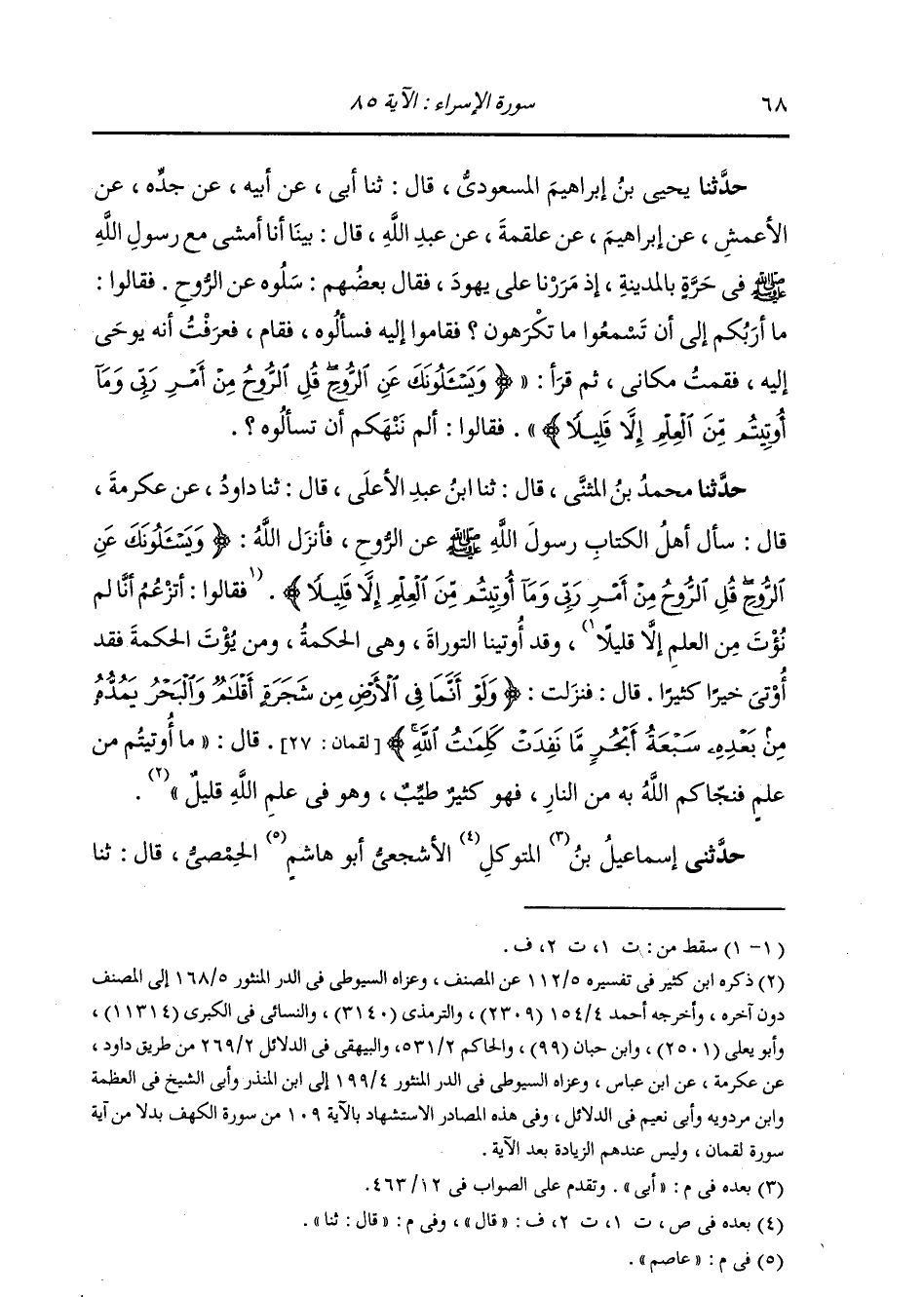 حَدَّثَنِي إِسْمَاعِيلُ بْنُ أَبِي الْمُتَوَكِّلِ، قَالَ: ثنا الْأَشْجَعِيُّ أَبُو عَاصِمٍ الْحِمْصِيُّ، قَالَ: ثنا -[69]- إِسْحَاقُ بْنُ عِيسَى أَبُو يَعْقُوبَ، قَالَ: ثنا الْقَاسِمُ بْنُ مَعْنٍ، عَنِ الْأَعْمَشِ، عَنْ إِبْرَاهِيمَ، عَنْ عَلْقَمَةَ، عَنْ عَبْدِ اللَّهِ، قَالَ: §إِنِّي لَمَعَ النَّبِيِّ صَلَّى اللهُ عَلَيْهِ وَسَلَّمَ فِي حَرْثٍ بِالْمَدِينَةِ، إِذْ أَتَاهُ يَهُودِيُّ، قَالَ: يَا أَبَا الْقَاسِمِ، مَا الرُّوحُ؟ فَسَكَتَ النَّبِيُّ صَلَّى اللهُ عَلَيْهِ وَسَلَّمَ، وَأَنْزَلَ اللَّهُ عَزَّ وَجَلَّ: {وَيَسْأَلُونَكَ عَنِ الرُّوحِ قُلِ الرُّوحُ مِنْ أَمْرِ رَبِّي} [الإسراء: 85]