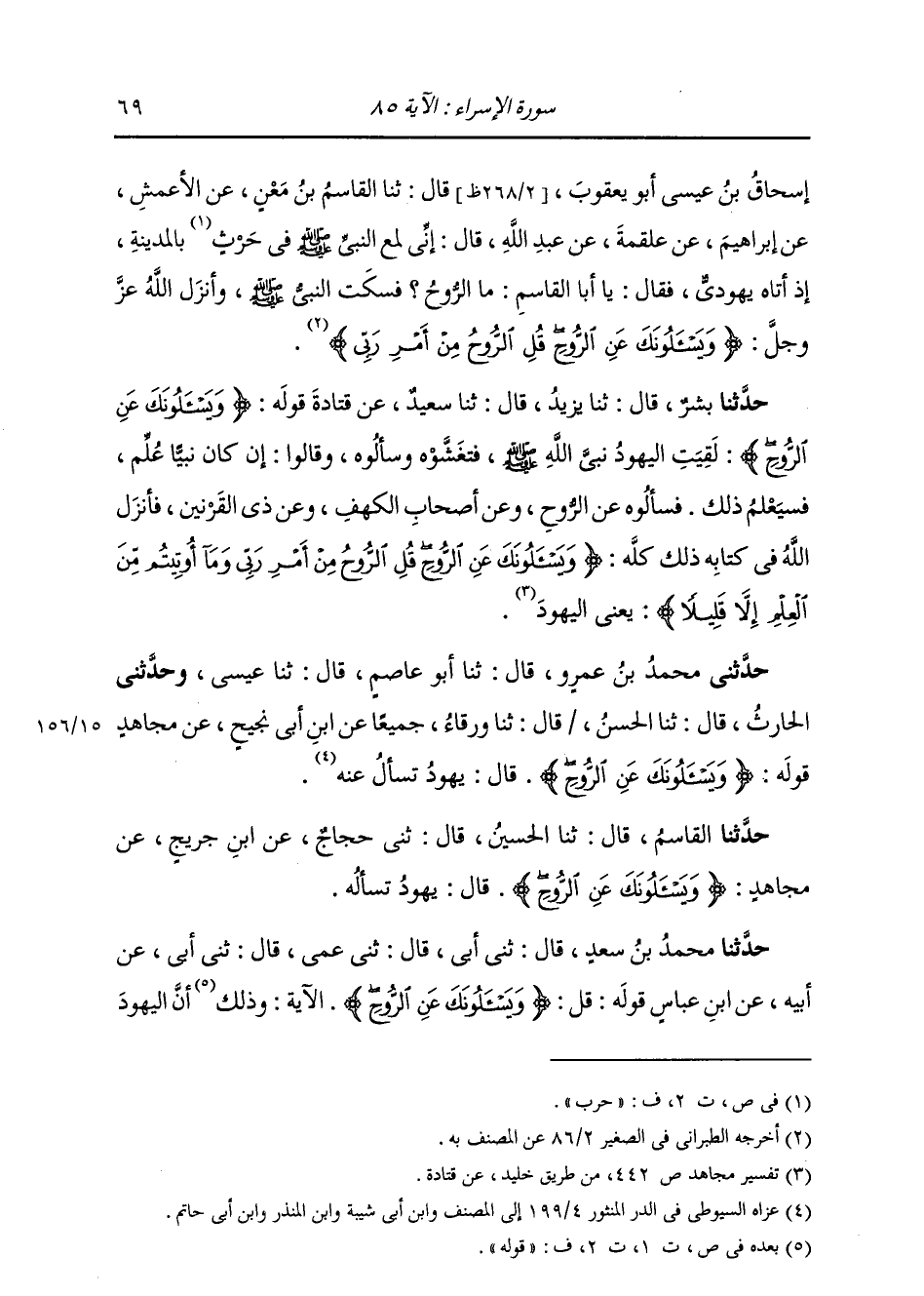 حَدَّثَنِي مُحَمَّدُ بْنُ عَمْرٍو، قَالَ: ثنا أَبُو عَاصِمٍ، قَالَ: ثنا عِيسَى، وَحَدَّثَنِي الْحَارِثُ، قَالَ: ثنا الْحَسَنُ، قَالَ: ثنا وَرْقَاءُ، جَمِيعًا عَنِ ابْنِ أَبِي نَجِيحٍ، عَنْ مُجَاهِدٍ، قَوْلُهُ: {§وَيَسْأَلُونَكَ عَنِ الرُّوحِ،} [الإسراء: 85] قَالَ: يَهُودُ تَسْأَلُ عَنْهُ
