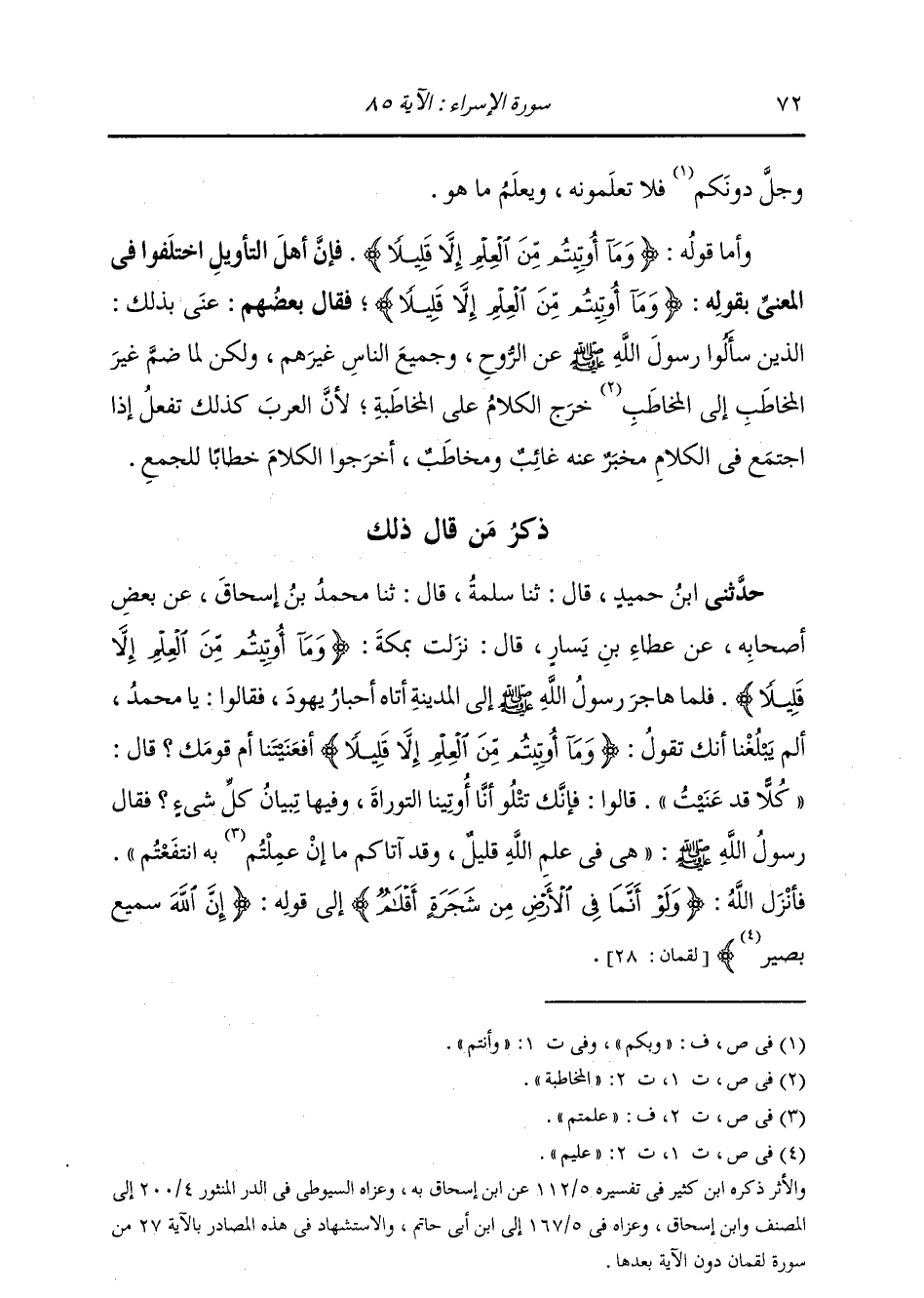 §وَأَمَّا قَوْلُهُ: {وَمَا أُوتِيتُمْ مِنَ الْعِلْمِ إِلَّا قَلِيلًا} [الإسراء: 85] فَإِنَّ أَهْلَ التَّأْوِيلِ اخْتَلَفُوا فِي الْمَعْنِيِّ بِقَوْلِهِ {وَمَا أُوتِيتُمْ مِنَ الْعِلْمِ إِلَّا قَلِيلًا} [الإسراء: 85] فَقَالَ بَعْضُهُمْ: عَنَى بِذَلِكَ: الَّذِينَ سَأَلُوا رَسُولَ اللَّهِ صَلَّى اللهُ عَلَيْهِ وَسَلَّمَ عَنِ الرُّوحِ وَجَمِيعِ النَّاسِ غَيْرِهِمْ، وَلَكِنْ لَمَّا ضَمَّ غَيْرَ الْمُخَاطَبِ إِلَى الْمُخَاطَبِ، خَرَجَ الْكَلَامُ عَلَى الْمُخَاطَبَةِ، لِأَنَّ الْعَرَبَ كَذَلِكَ تَفْعَلُ إِذَا اجْتَمَعَ فِي الْكَلَامِ مُخْبَرٌ عَنْهُ غَائِبٌ وَمُخَاطَبٌ أَخْرَجُوا الْكَلَامَ خِطَابًا لِلْجَمْعِ