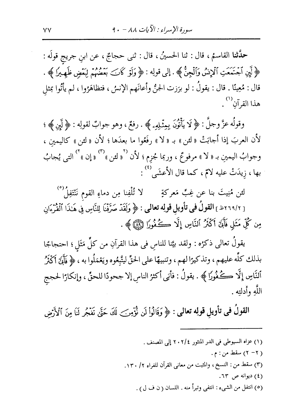 §وَقَوْلُهُ عَزَّ وَجَلَّ {لَا يَأْتُونَ بِمِثْلِهِ} [الإسراء: 88] رَفْعٌ، وَهُوَ جَوَابٌ لِقَوْلِهِ «لَئِنْ» ، لِأَنَّ الْعَرَبَ إِذَا أَجَابَتْ لَئِنْ بِلَا رَفَعُوا مَا بَعْدَهَا، لِأَنَّ «لَئِنْ» كَالْيَمِينِ وَجَوَابُ الْيَمِينِ بِلَا مَرْفُوعٌ، وَرُبَّمَا جُزِمَ لِأَنَّ الَّتِي يُجَابُ بِهَا زِيدَتْ عَلَيْهِ لَامٌ، كَمَا قَالَ الْأَعْشَى: