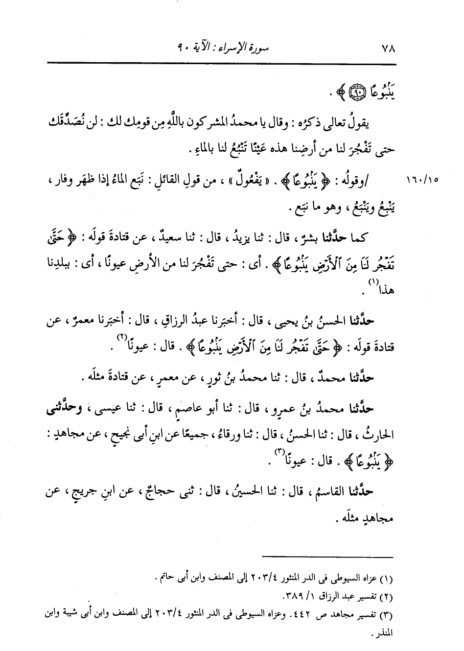 حَدَّثَنَا الْحَسَنُ بْنُ يَحْيَى، قَالَ: أَخْبَرَنَا عَبْدُ الرَّزَّاقِ، قَالَ: أَخْبَرَنَا مَعْمَرٌ، عَنْ قَتَادَةَ، قَوْلُهُ {§حَتَّى تَفْجُرَ لَنَا مِنَ الْأَرْضِ يَنْبُوعًا} [الإسراء: 90] قَالَ: عُيُونًا حَدَّثَنَا مُحَمَّدٌ، قَالَ: ثنا مُحَمَّدُ بْنُ ثَوْرٍ، عَنْ مَعْمَرٍ، عَنْ قَتَادَةَ، مِثْلَهُ