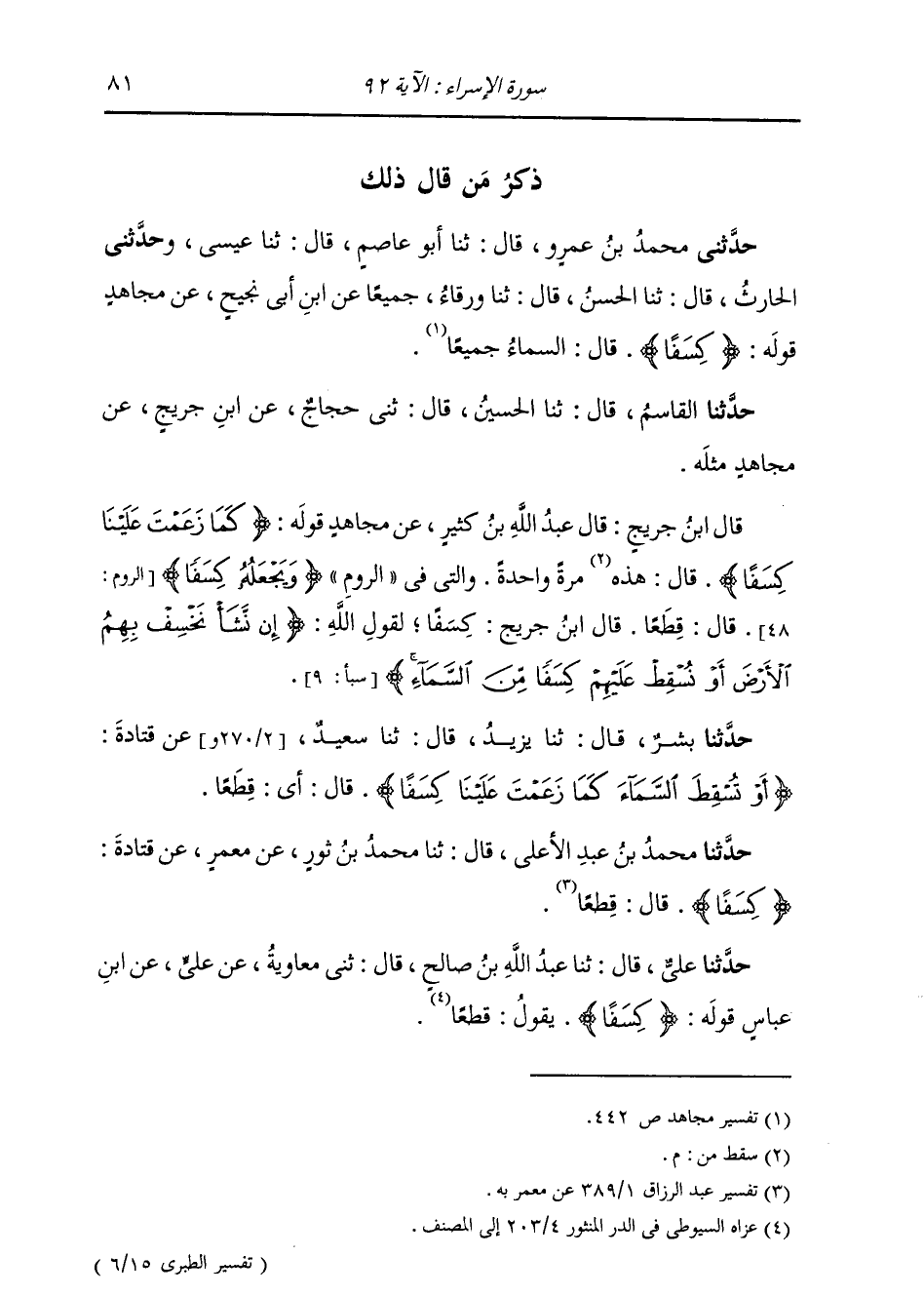 ذِكْرُ مَنْ قَالَ ذَلِكَ: حَدَّثَنِي مُحَمَّدُ بْنُ عَمْرٍو، قَالَ: ثنا أَبُو عَاصِمٍ، قَالَ: ثنا عِيسَى، وَحَدَّثَنِي الْحَارِثُ، قَالَ: ثنا الْحَسَنُ، قَالَ: ثنا وَرْقَاءُ، جَمِيعًا عَنِ ابْنِ أَبِي نَجِيحٍ، عَنْ مُجَاهِدٍ، قَوْلُهُ {§كِسَفًا} [الإسراء: 92] قَالَ: السَّمَاءُ جَمِيعًا حَدَّثَنَا الْقَاسِمُ، قَالَ: ثنا الْحُسَيْنُ، قَالَ: ثني حَجَّاجٌ، عَنِ ابْنِ جُرَيْجٍ، عَنْ مُجَاهِدٍ، مِثْلَهُ