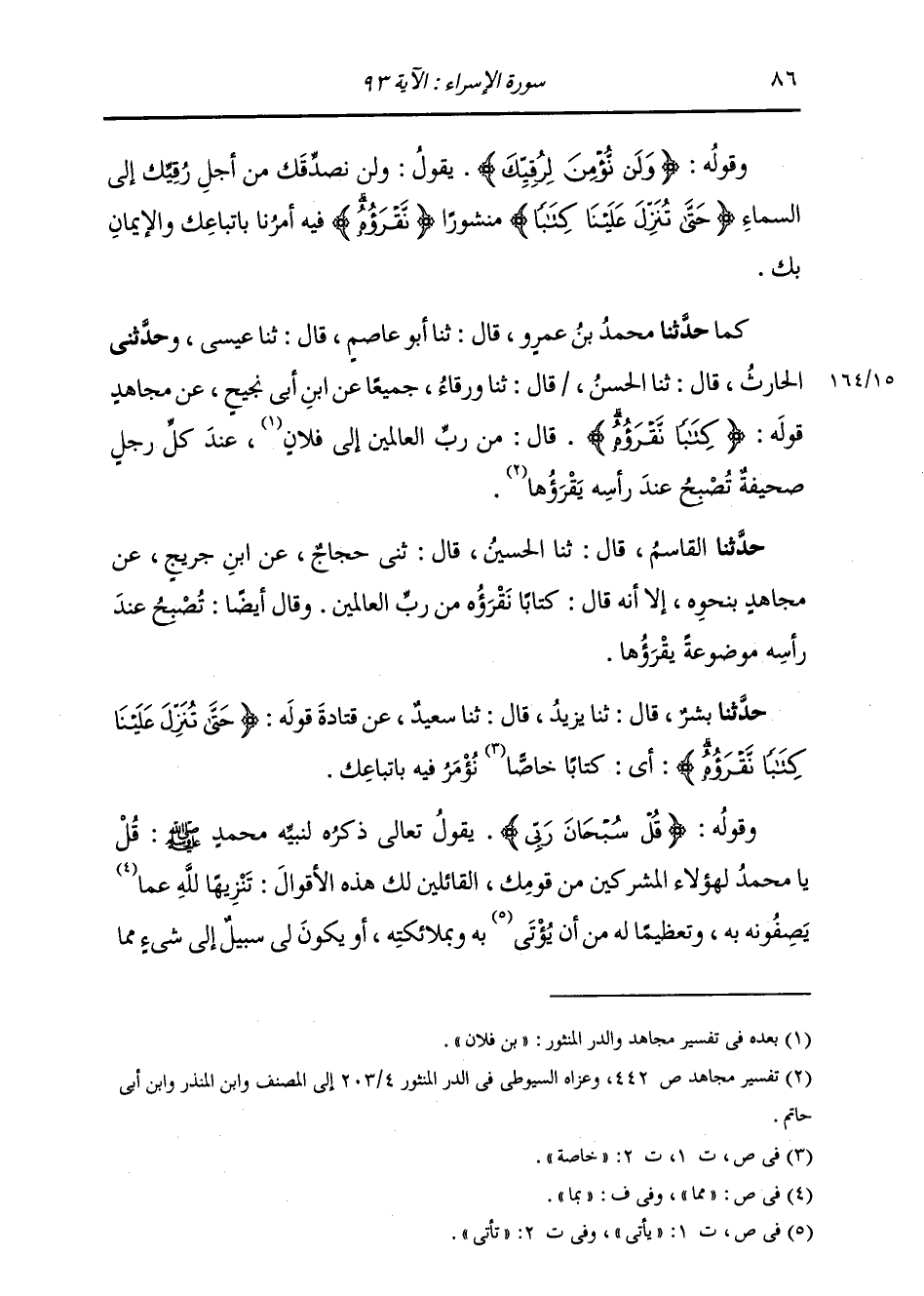 حَدَّثَنَا بِشْرٌ، قَالَ: ثنا يَزِيدُ، قَالَ: ثنا سَعِيدٌ، عَنْ قَتَادَةَ، قَوْلُهُ {§حَتَّى تُنَزِّلَ عَلَيْنَا كِتَابًا نَقْرَؤُهُ} [الإسراء: 93] أَيْ كِتَابًا خَاصًّا نُؤْمَرُ فِيهِ بِاتِّبَاعِكَ