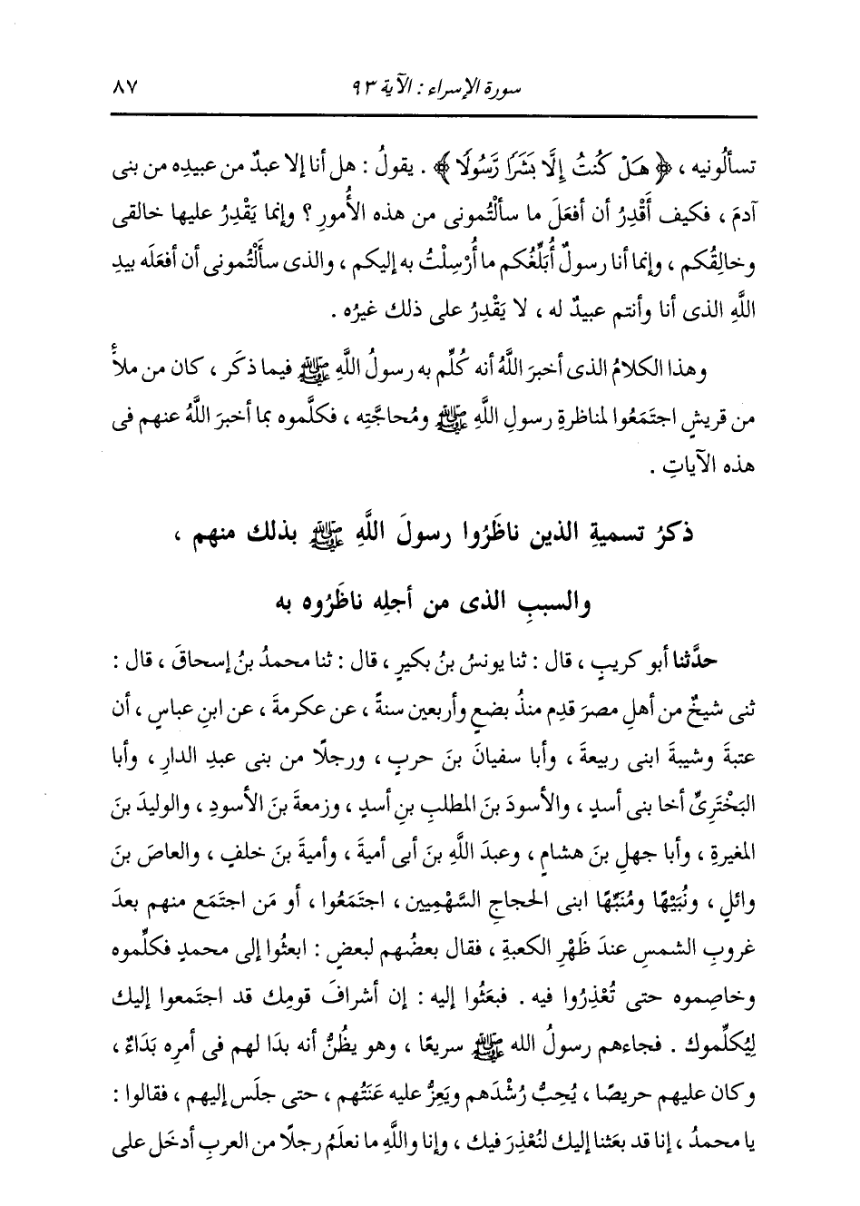 تَسْأَلُونِيهِ: {هَلْ كُنْتُ إِلَّا بَشَرًا رَسُولًا} [الإسراء: 93] يَقُولُ: هَلْ أَنَا إِلَّا عَبْدٌ مِنِ عَبِيدِهِ مِنْ بَنِي آدَمَ، فَكَيْفَ أَقْدِرُ أَنْ أَفْعَلَ مَا سَأَلْتُمُونِي مِنْ هَذِهِ الْأُمُورِ، وَإِنَّمَا يَقْدِرُ عَلَيْهَا خَالِقِي وَخَالِقُكُمْ، وَإِنَّمَا أَنَا رَسُولُ أُبْلِغُكُمْ مَا أُرْسِلْتُ بِهِ إِلَيْكُمْ، وَالَّذِي سَأَلْتُمُونِي أَنْ أَفْعَلَهُ بِيَدِ اللَّهِ الَّذِي أَنَا وَأَنْتُمْ عَبِيدٌ لَهُ، لَا يَقْدِرُ عَلَى ذَلِكَ غَيْرُهُ. وَهَذَا الْكَلَامُ الَّذِي أَخْبَرَ اللَّهُ أَنَّهُ كُلِّمَ بِهِ رَسُولُ اللَّهِ صَلَّى اللهُ عَلَيْهِ وَسَلَّمَ فِيمَا ذَكَرَ كَانَ مِنْ مَلَإٍ مِنْ قُرَيْشٍ اجْتَمَعُوا لِمُنَاظَرَةِ رَسُولِ اللَّهِ صَلَّى اللهُ عَلَيْهِ وَسَلَّمَ وَمُحَاجَّتِهِ، فَكَلَّمُوهُ بِمَا أَخْبَرَ اللَّهُ عَنْهُمْ فِي هَذِهِ الْآيَاتِ. ذِكْرُ تَسْمِيَةِ الَّذِينَ نَاظَرُوا رَسُولَ اللَّهِ صَلَّى اللهُ عَلَيْهِ وَسَلَّمَ بِذَلِكَ مِنْهُمْ وَالسَّبَبُ الَّذِي مِنْ أَجْلِهِ نَاظَرُوهُ بِهِ