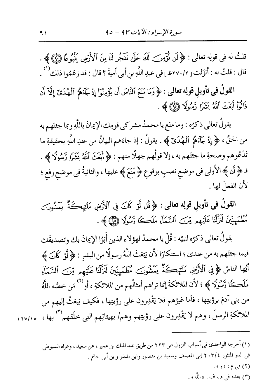 §الْقَوْلُ فِي تَأْوِيلِ قَوْلِهِ تَعَالَى {وَمَا مَنَعَ النَّاسَ أَنْ يُؤْمِنُوا إِذْ جَاءَهُمُ الْهُدَى إِلَّا أَنْ قَالُوا أَبَعَثَ اللَّهُ بَشَرًا رَسُولًا} [الإسراء: 94] يَقُولُ تَعَالَى ذِكْرُهُ: وَمَا مَنَعَ يَا مُحَمَّدُ مُشْرِكِي قَوْمِكَ الْإِيمَانَ بِاللَّهِ، وَبِمَا جِئْتَهُمْ بِهِ مِنَ الْحَقِّ {إِذْ جَاءَهُمُ الْهُدَى} [الإسراء: 94] يَقُولُ: إِذْ جَاءَهُمُ الْبَيَانُ مِنْ عِنْدِ اللَّهِ بِحَقِيقَةِ مَا تَدْعُوهُمْ وَصِحَّةِ مَا جِئْتَهُمْ بِهِ، إِلَّا قَوْلُهُمْ جَهْلًا مِنْهُمْ {أَبَعَثَ اللَّهُ بَشَرًا رَسُولًا} [الإسراء: 94] فَأَنِ الْأُولَى فِي مَوْضِعِ نَصْبٍ بِوُقُوعِ مَنَعَ عَلَيْهَا، وَالثَّانِيَةُ فِي مَوْضِعِ رَفْعٍ، لِأَنَّ الْفِعْلَ لَهَا
