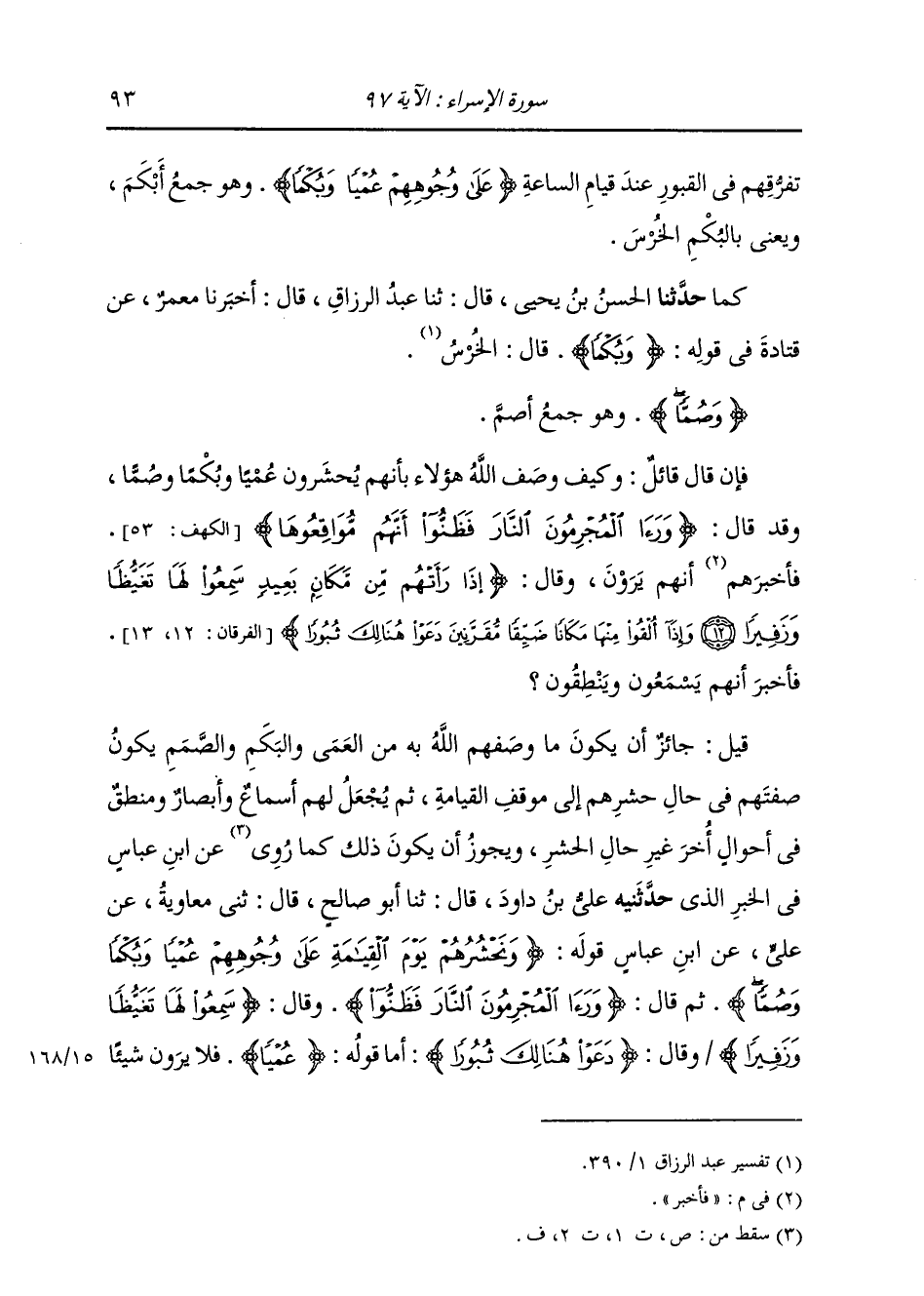 حَدَّثَنَا الْحَسَنُ بْنُ يَحْيَى، قَالَ: ثنا عَبْدُ الرَّزَّاقِ، قَالَ: أَخْبَرَنَا مَعْمَرٌ، عَنْ قَتَادَةَ، فِي قَوْلِهِ: {§وَبُكْمًا} [الإسراء: 97] قَالَ: الْخَرَسُ {وَصُمًّا} [الإسراء: 97] وَهُوَ جَمْعُ أَصَمَّ فَإِنْ قَالَ قَائِلٌ: وَكَيْفَ وَصَفَ اللَّهُ هَؤُلَاءِ بِأَنَّهُمْ يُحْشَرُونَ عُمْيًا وَبُكْمًا وَصُمًّا، وَقَدْ قَالَ {وَرَأَى الْمُجْرِمُونَ النَّارَ فَظُنُّوا أَنَّهُمْ مُوَاقِعُوهَا} [الكهف: 53] فَأَخْبَرَ أَنَّهُمْ يَرَوْنَ، وَقَالَ: {إِذَا رَأَتْهُمْ مِنْ مَكَانٍ بَعِيدٍ سَمِعُوا لَهَا تَغَيُّظًا وَزَفِيرًا وَإِذَا أُلْقُوا مِنْهَا مَكَانًا ضَيِّقًا مُقَرَّنِينَ دَعَوْا هُنَالِكَ ثُبُورًا} [الفرقان: 13] فَأَخْبَرَ أَنَّهُمْ، يَسْمَعُونَ وَيَنْطِقُونَ؟ قِيلَ: جَائِزٌ أَنْ يَكُونَ مَا وَصَفَهُمُ اللَّهُ بِهِ مِنَ الْعَمَى وَالْبَكَمِ وَالصَّمَمِ يَكُونُ صِفَتَهُمْ فِي حَالِ حَشْرِهِمْ إِلَى مَوْقِفِ الْقِيَامَةِ، ثُمَّ يُجْعَلُ لَهُمْ أَسْمَاعٌ وَأَبْصَارٌ وَمَنْطِقٌ فِي أَحْوَالٍ أُخَرَ غَيْرِ حَالِ الْحَشْرِ، وَيَجُوزُ أَنْ يَكُونَ ذَلِكَ، كَمَا رُوِيَ عَنِ ابْنِ عَبَّاسٍ فِي الْخَبَرِ الَّذِي: