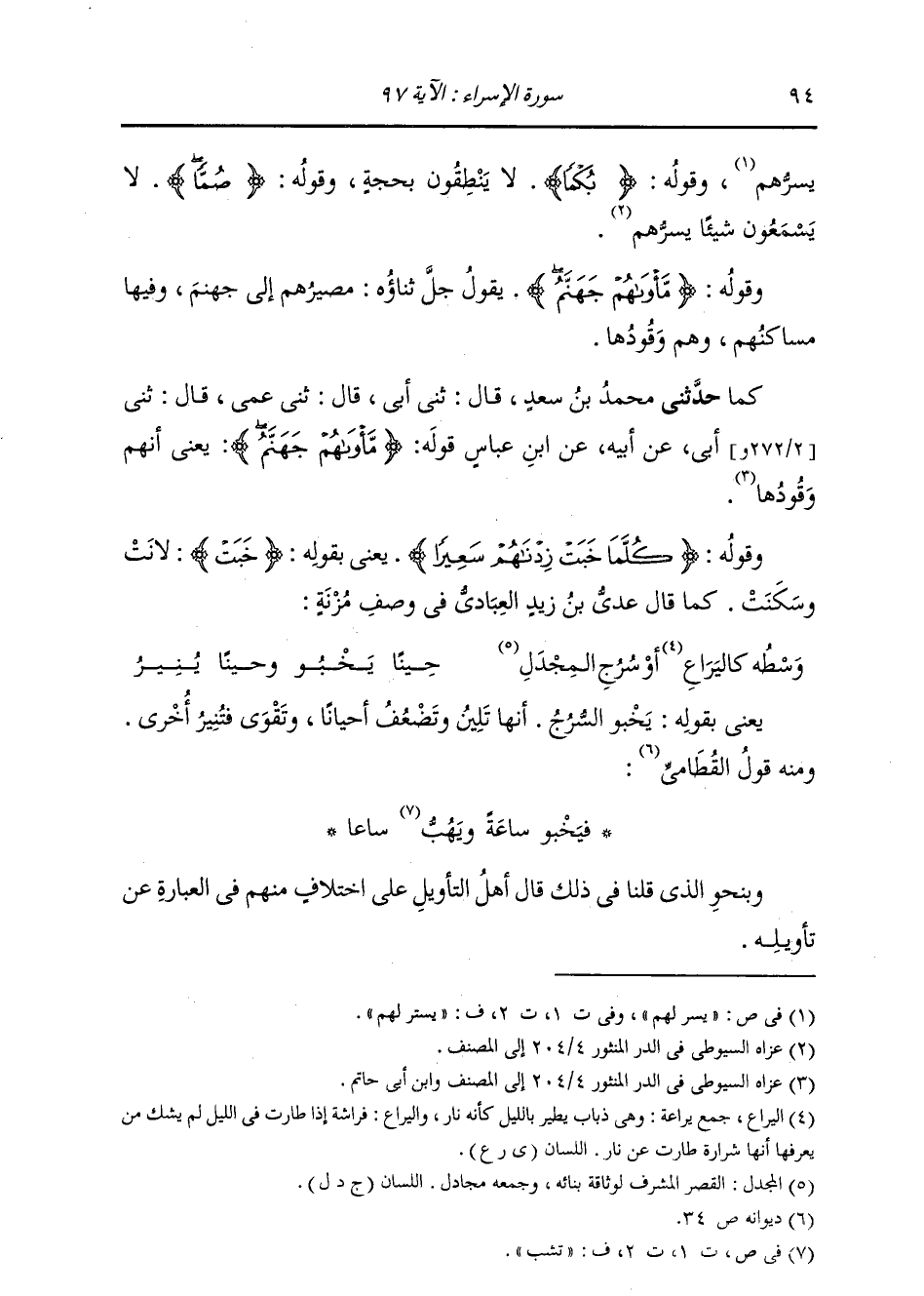 §وَقَوْلُهُ: كُلَّمَا خَبَتْ زِدْنَاهُمْ سَعِيرًا يَعْنِي بِقَوْلِهِ خَبَتْ: لَانَتْ وَسَكَنَتْ، كَمَا قَالَ عَدِيُّ بْنُ زَيْدٍ الْعِبَادِيُّ فِي وَصْفِ مُزْنَةٍ: وَسْطُهُ كَالْيَرَاعِ أَوْ سُرُجِ الْمِجْدَلِ حِينًا يَخْبُو وَحِينًا يُنِيرُ يَعْنِي بِقَوْلِهِ: يَخْبُو السُّرُجُ: أَنَّهَا تَلِينُ وَتَضْعُفُ أَحْيَانًا، وَتَقْوَى وَتُنِيرُ أُخْرَى، وَمِنْهُ قَوْلُ الْقُطَامِيِّ: فَيَخْبُو سَاعَةً وَيَهُبُّ سَاعَا وَبِنَحْوِ الَّذِي قُلْنَا فِي ذَلِكَ، قَالَ أَهْلُ التَّأْوِيلِ عَلَى اخْتِلَافٍ مِنْهُمْ فِي الْعِبَارَةِ عَنْ تَأْوِيلِهِ