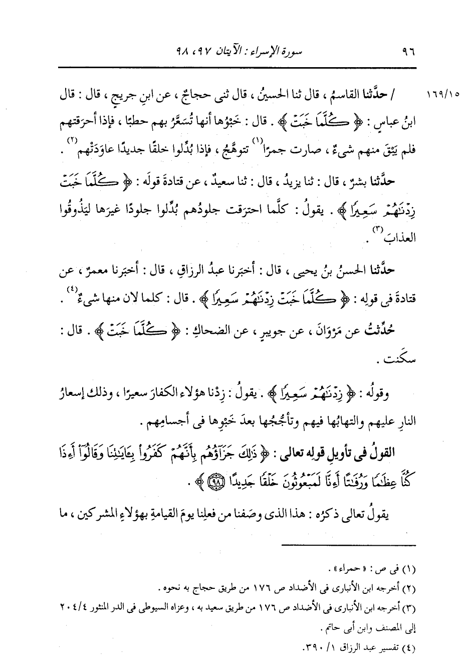 حَدَّثَنَا الْقَاسِمُ، قَالَ: ثنا الْحُسَيْنُ، قَالَ: ثني حَجَّاجٌ، عَنِ ابْنِ جُرَيْجٍ، قَالَ: قَالَ ابْنُ عَبَّاسٍ {§كُلَّمَا خَبَتْ} [الإسراء: 97] قَالَ: خُبُوُّهَا أَنَّهَا تُسَعَّرُ بِهِمْ حَطَبًا، فَإِذَا أَحْرَقَتْهُمْ فَلَمْ يَبْقَ مِنْهُمْ شَيْءٌ صَارَتْ جَمْرًا تَتَوَهَّجُ، فَإِذَا بُدِّلُوا خَلْقًا جَدِيدًا عَاوَدَتْهُمْ